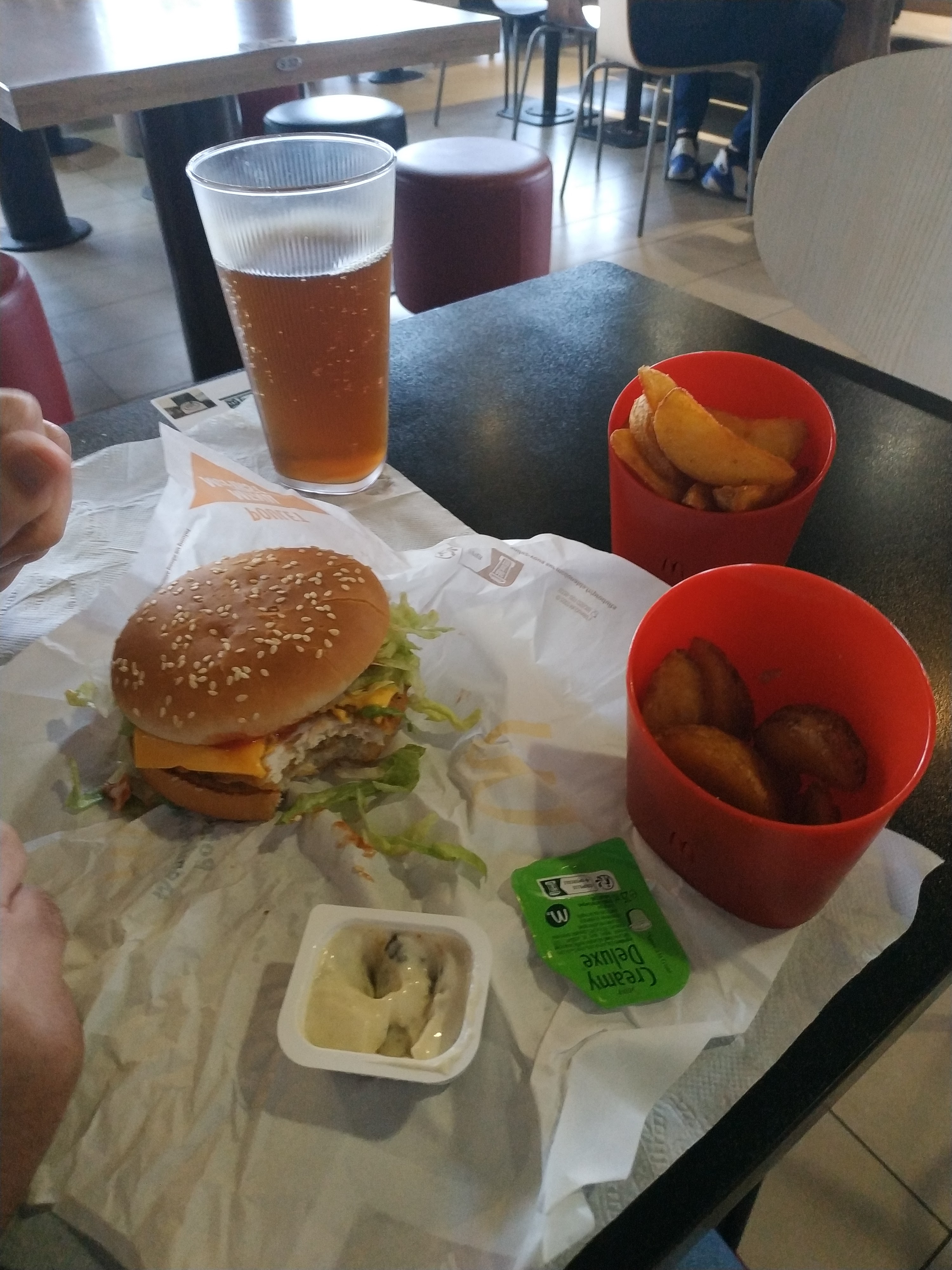Arrivé sur place, uniquement 2 bornes activées pour aucune raison, ce qui fait qu’il y a une incomprehension entre les personnes qui attendent pour les bornes, et ceux pour leur commandes à emporter. La salle était sale malgré un équipier au lobby très souriant et très serviable lorsqu’on lui demande quoi que ce soit, peut-être un peu d’aides pour ce jeune homme impliqué corps et âmes. Ce qui n’est pas commun a tous les autres équipiers de ce Mc Donald’s. Commande arrivée très rapidement… trop rapidement ? L’oubli du jouet et de la modification du burger (dont un ingredient qui devait être retiré et qui ne l’a pas été fait; n’imaginons même pas pour les personnes allergiques)