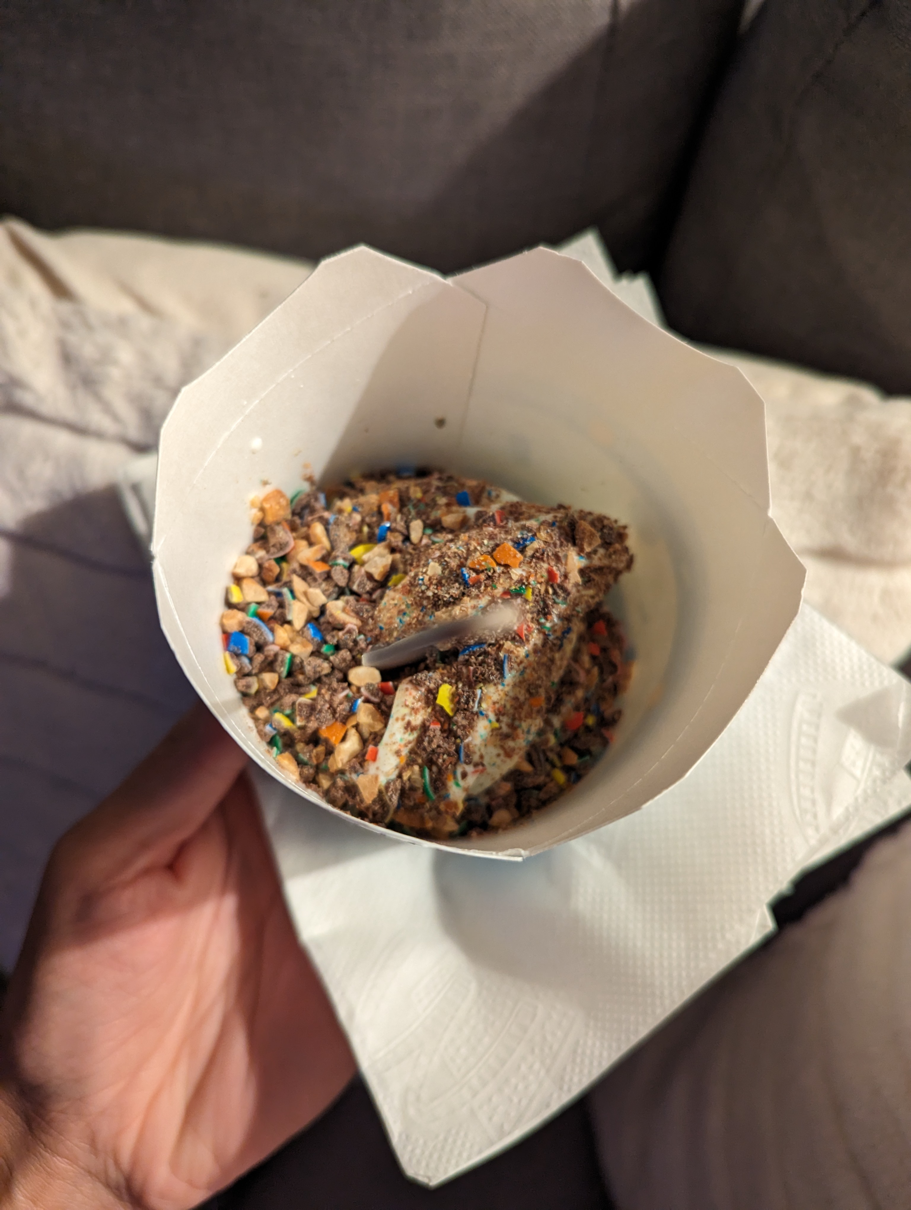 Commandé Very Parfait au chocolat avec nappage chocolat Alors déjà pas de chantilly, glace à la vanille et aucun nappage ! Mac Flurry M&m's Choco... La glace c'était de l'eau ! Nous avons attendu plus de 30 min pour être servi alors que des personnes arrivées après nous ont été servi avant nous alors qu'ils ont commandé du chaud ! De plus restaurant très sale et pas de pass sanitaire demandé à l'entrée ! Je n'y mettrai plus les pieds !