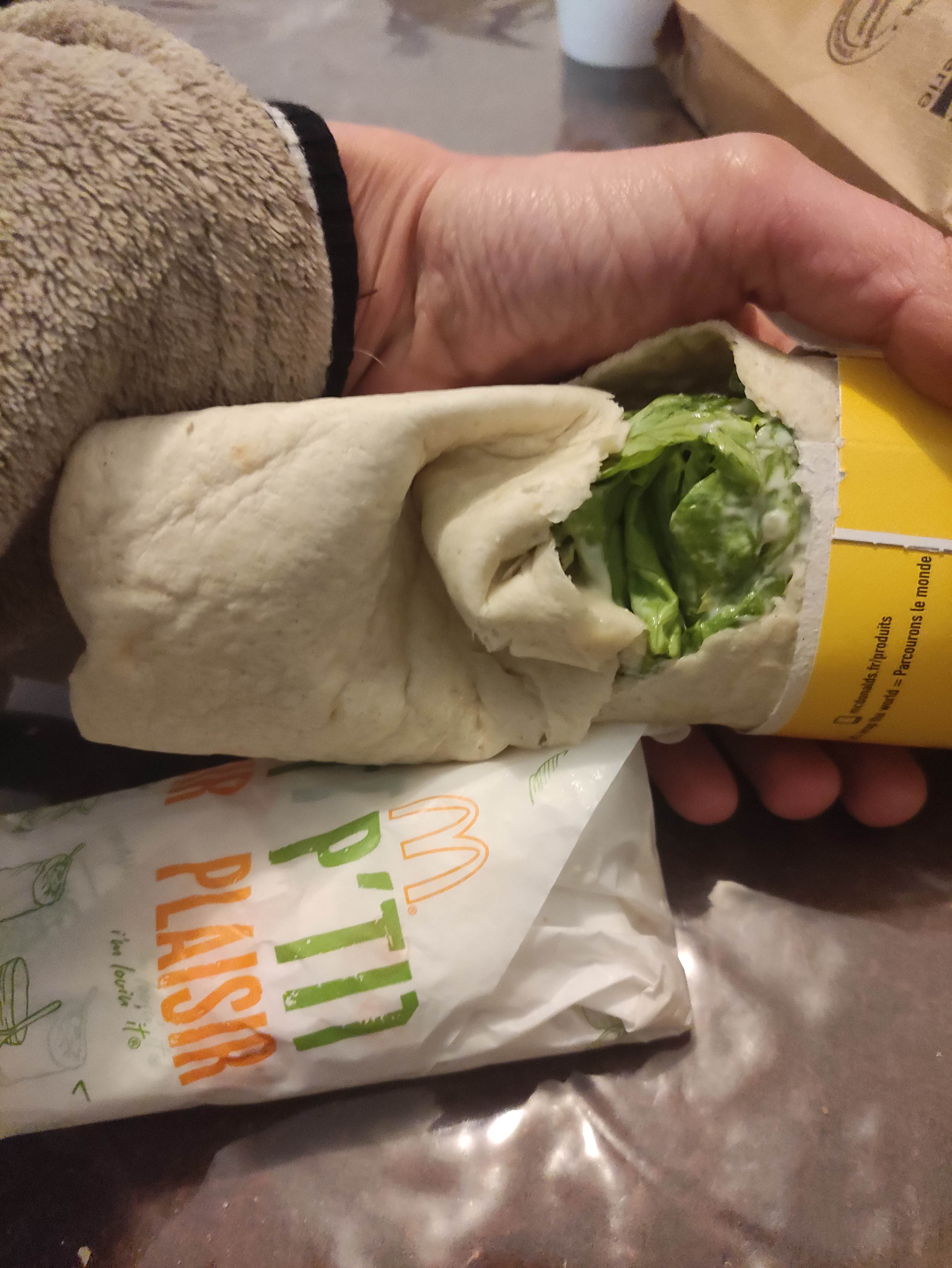 On ne repart jamais sans contrôler notre commande...et oui, trop souvent, il manque quelque chose. La dernière fois c'était un Mac wrap! Aujourd'hui, on rentre après contrôle. Le Mac wrap est bien là mais hélas en croquant dedans, ce n'est pas le bon. Lamentable. Sans compter les patatoes qui se baladent dans le frites... Va-t-on devoir goûter après le contrôle et vider les paquets de frites en plus ?