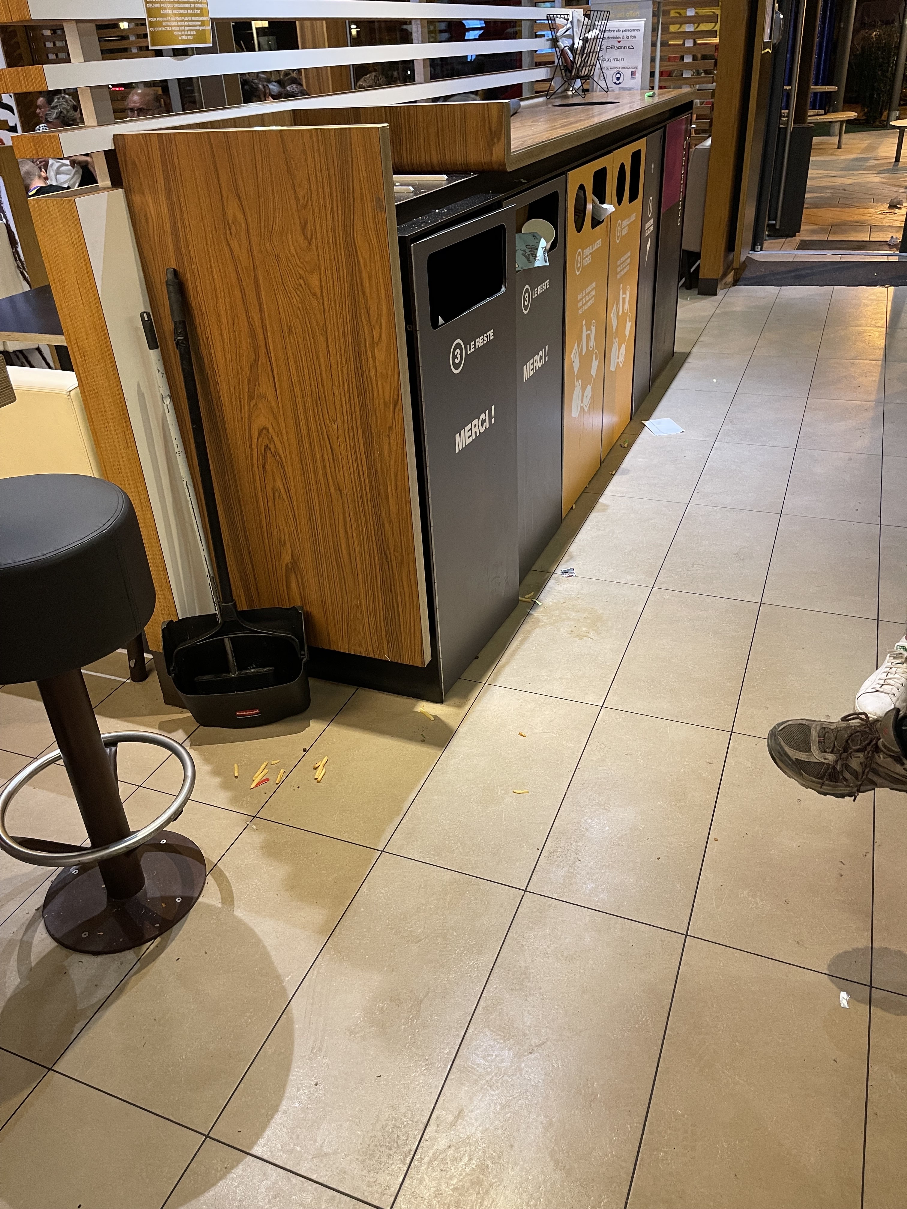 D’habitude je ne met jamais d’avis mais je n’est jamais vue un max do aussi sale de toute ma vie et aussi plus de 1h d’attente pour avoir notre commande avec des boissons qui ne sont même pas fraîche et des frites trop cuites un wrap avec la galette sèche bref plus mais j’y mettais les pieds La photo et juste l’états du sol je n’est pas pris les tables qui sont elles toutes aussi sale je n’imagine même pas l’état des cuisine .