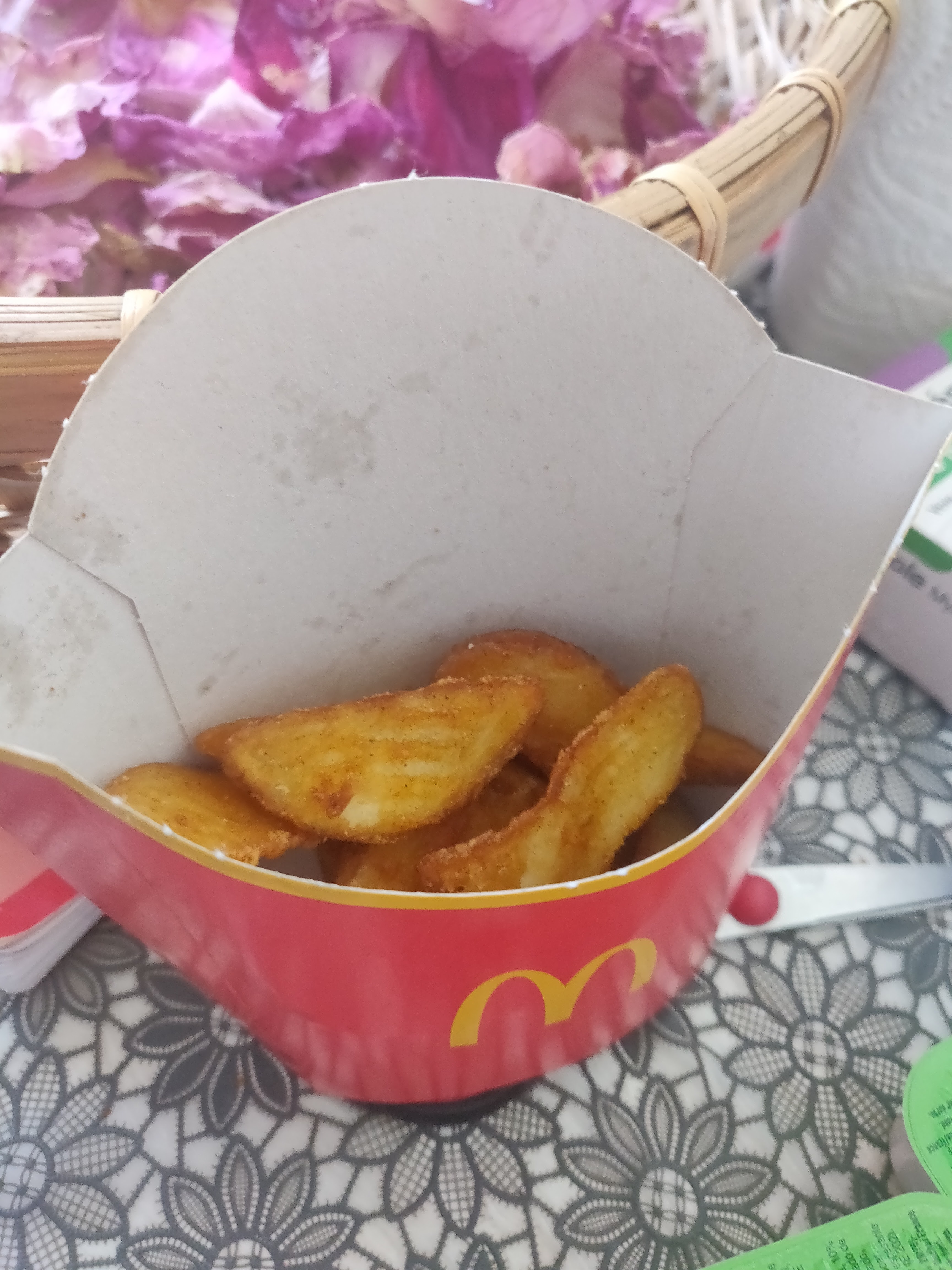 Les 4 frites et potatoes absentes, emballage de big Tasty mais un hamburger plus petit dedans pour deux des sandwichs, et juste 3 nuggets au lieu de 4 dans le happy meal (qui était le seul à avoir sa frite). La dernière fois, c’était les frites à moitié de carton. C’est la première fois que je vois des oublis pareils pourtant cliente mcDo depuis 35 ans