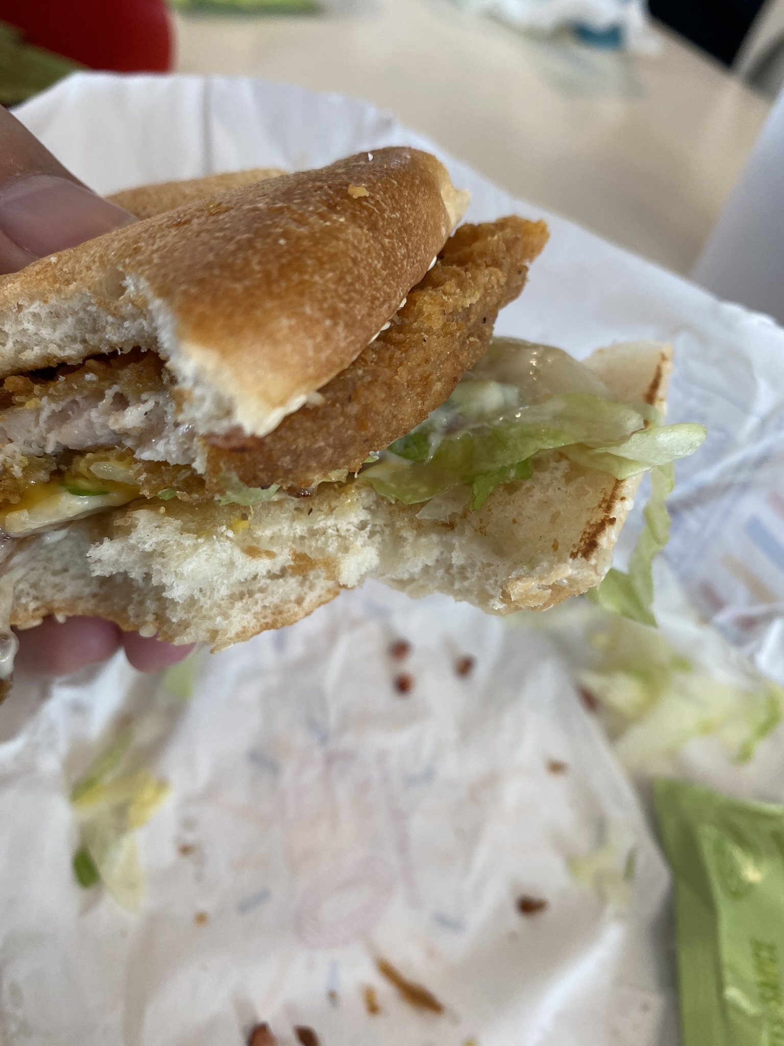 Filet dont le poisson est sec. J’ai déjà travaillé au mac donald et c’est un produit qui ne devait pas être servi. Si vous ne faites pas vos rotations de FCN, servait juste vos produits à la demande. J’ai des enfants, un minimum serait respectable pour eux.