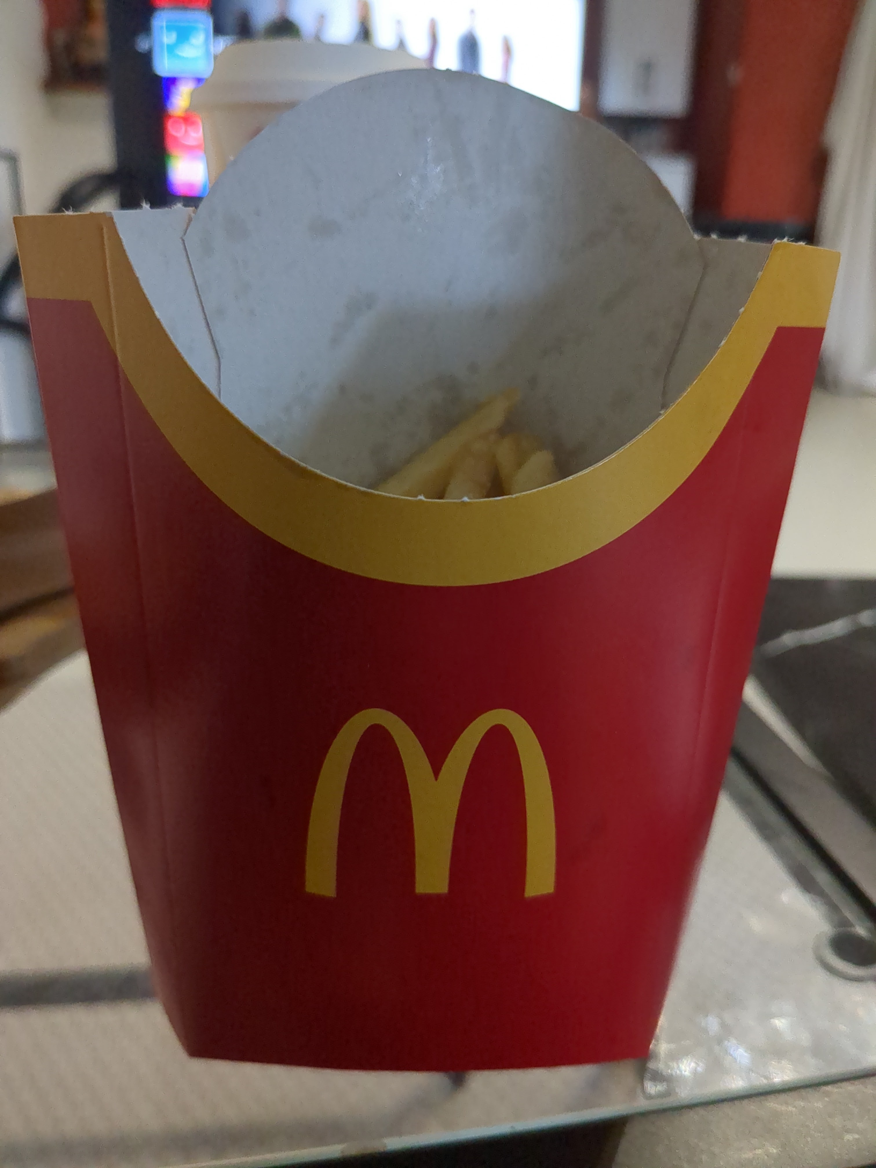 Ma commande est restée devant mes yeux plus de 20mn sur le pupitre à attendre un malheureux coca pour une vente à emporter. Du coup tout était froid. Il y a pas plus dégoûtant que des frites froides. Au prix que coûte un Mc Donald's aujourd'hui je trouve ça inadmissible.