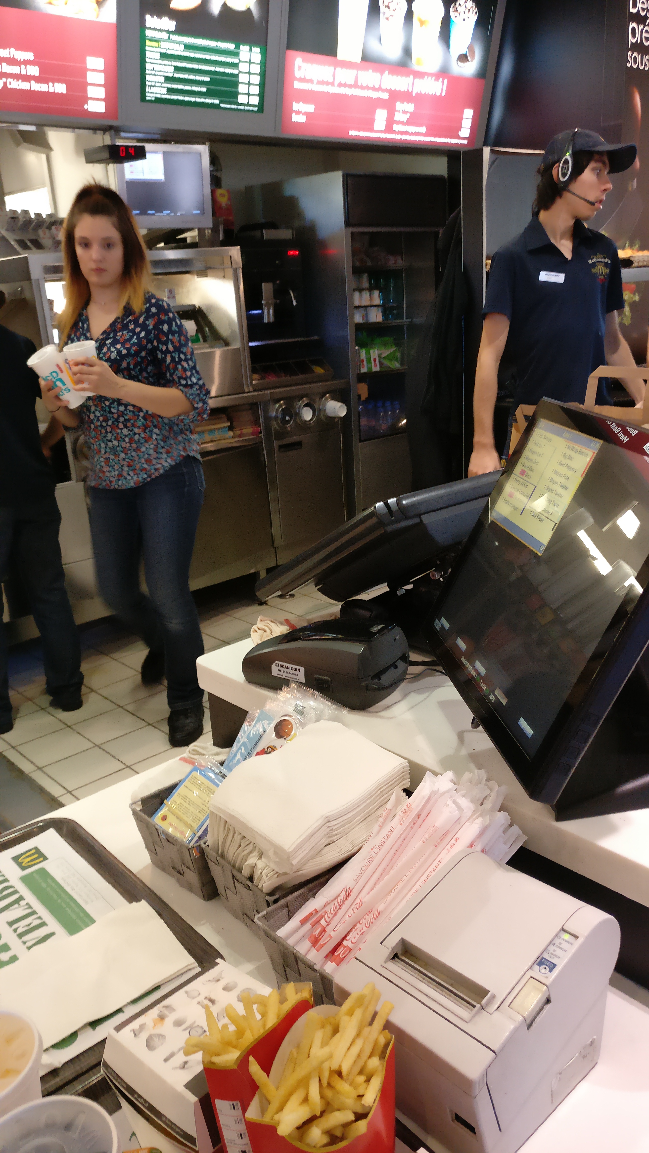Comment dire... simplement 3 clients donc loin d'être dans les piques de fréquentation. Néanmoins avons attendus plus de 27 minutes pour avoir notre commande malgré la présence d'une équipe loin d'être en sous effectifs ! Résultat frutesxet sandwichs froid Faut dire que les uns et autres passe plus de temps à rire entre eux au lieu de servirent les clients... sans oublier une des coéquipière qui ce gratte les cheveux ou le nez qui ne passe absolument pas par le poste de lavage de mains... qui essuie le sol et qui prepare en même temps des desserts, même histoire... la salle de restaurant et dans un état pitoyable... nous constatons également que les commandes sont commençaient et non terminer et reprise lorsque qu'un coéquipier passe et la termine selon sont courage. Les cartons arrivant de la réserve sont directement posé sur les plans de travail... brefs je reste encore très très surpris lorsque l'on sait au combien les process de Macdonald sont draconien ! Je précise qu'un seul des coéquipiers c'est excusé pour l'attente et la situation générale seul ce garçon était conscient de son professionnalisme à avoir merci à lui . Je ne conseil pas dutout ce restaurant .