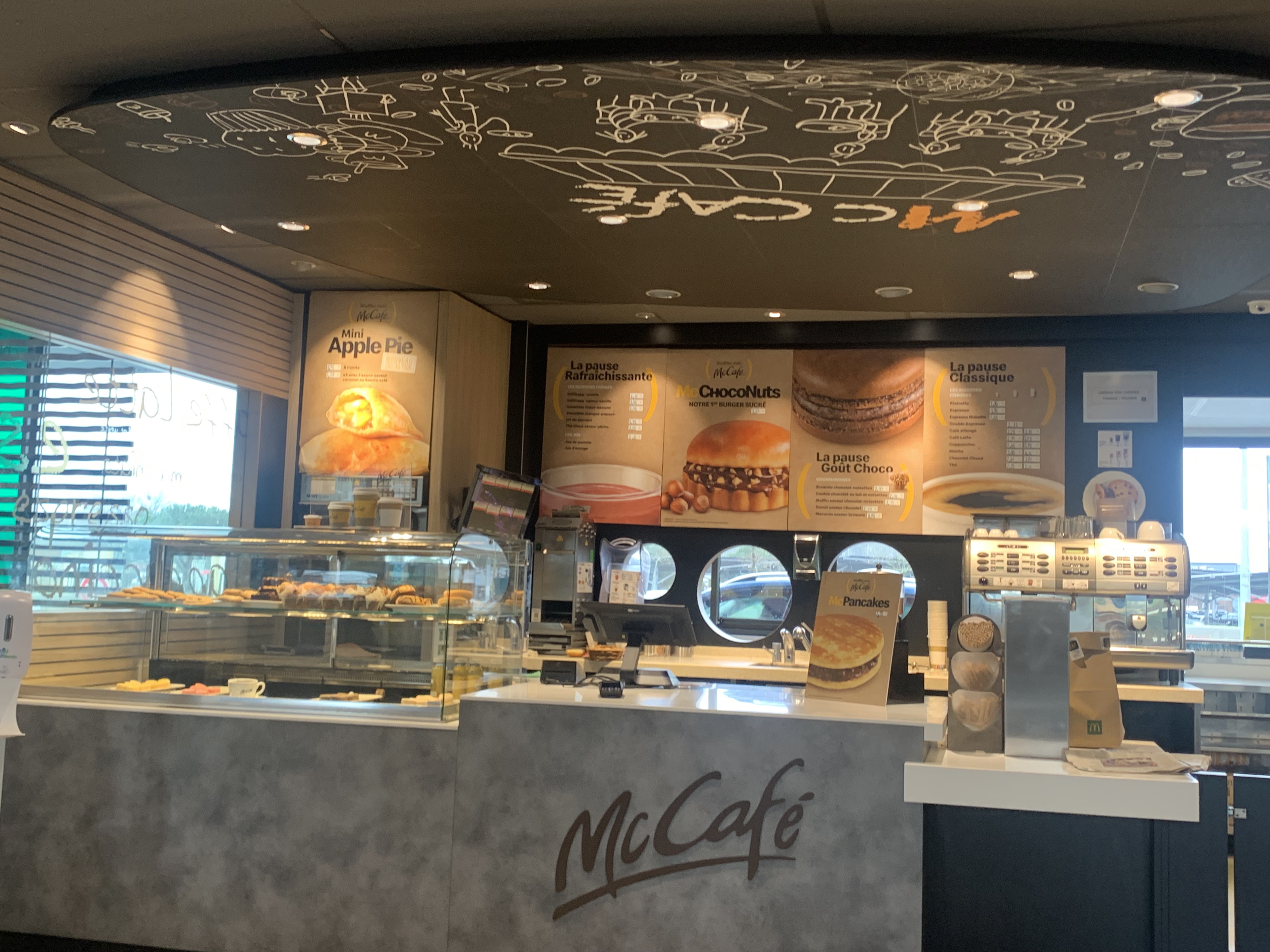De passage avec ma fille de 2 ans et un couple d'amis. La salle est jolie et semble propre. Je n'ai pas été voir l'aire de jeu donc pas d'avis à ce sujet. Commande par borne tactile. La commande a été vite préparée. Le Happy Meal n'est pas cher et il y a tout ce qu'il faut pour un repas d'enfant. Le petit moins: C'est compliqué de payer au comptoir car il s'agit du comptoir mac café donc il y a beaucoup de monde, en plus des gens qui attendent leur commande à emporter. On ne sais pas trop qui fait la queue ou pas. Très confus. Pareil pour récupérer la glace après le repas, on ne sais pas trop où se mettre parmi tous les gens qui attendent ou font la queue.