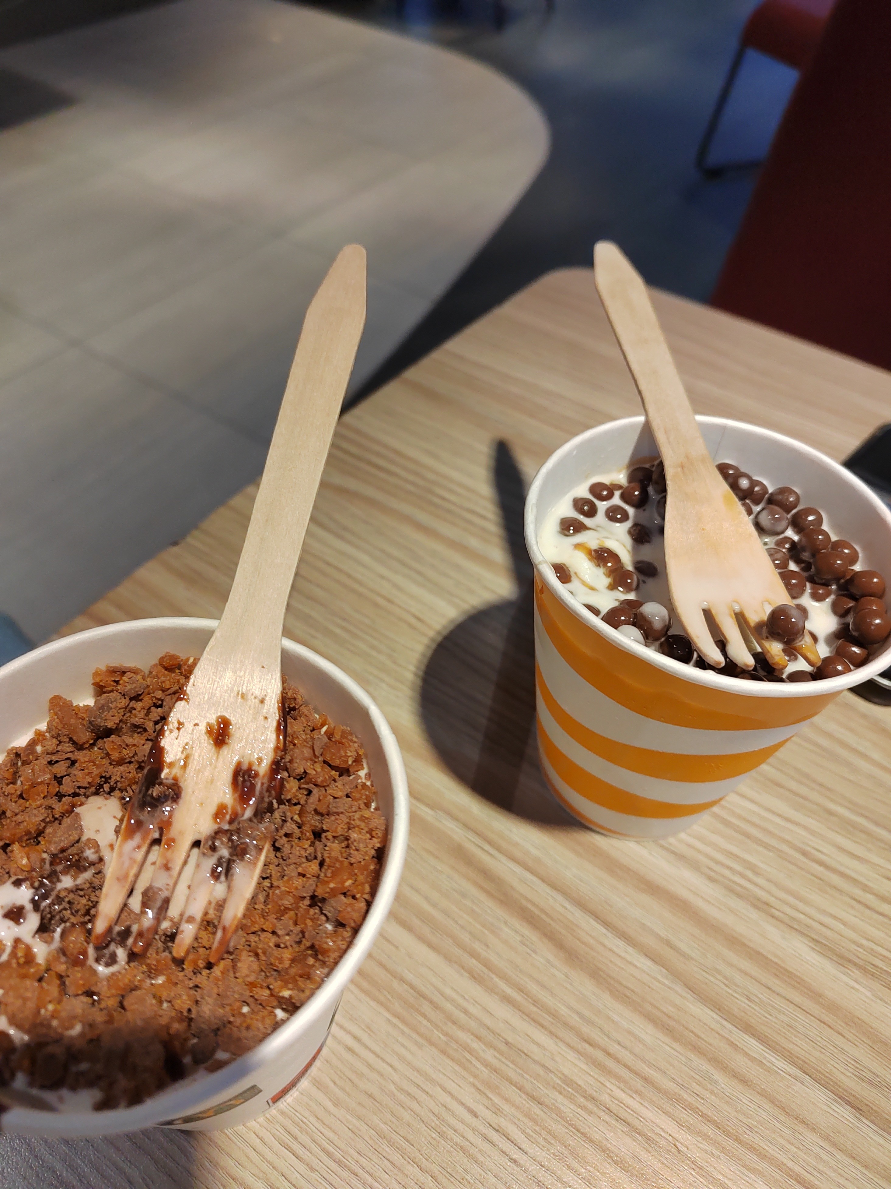 Un serveur agréable et professionnel à environ 22h. Heureusement! Ils sauvent mon avis. Par contre, très déçue de l'attitude des serveuses lors de la récupération des 2 desserts glacés. On ne me donne pas les bons arômes commandés sous pretexte que la machine ne fonctionne pas, elles rigolent entre elles et aucune excuses ni dedomagement. Je repars avec des desserts glacés différents, frustrant!!
