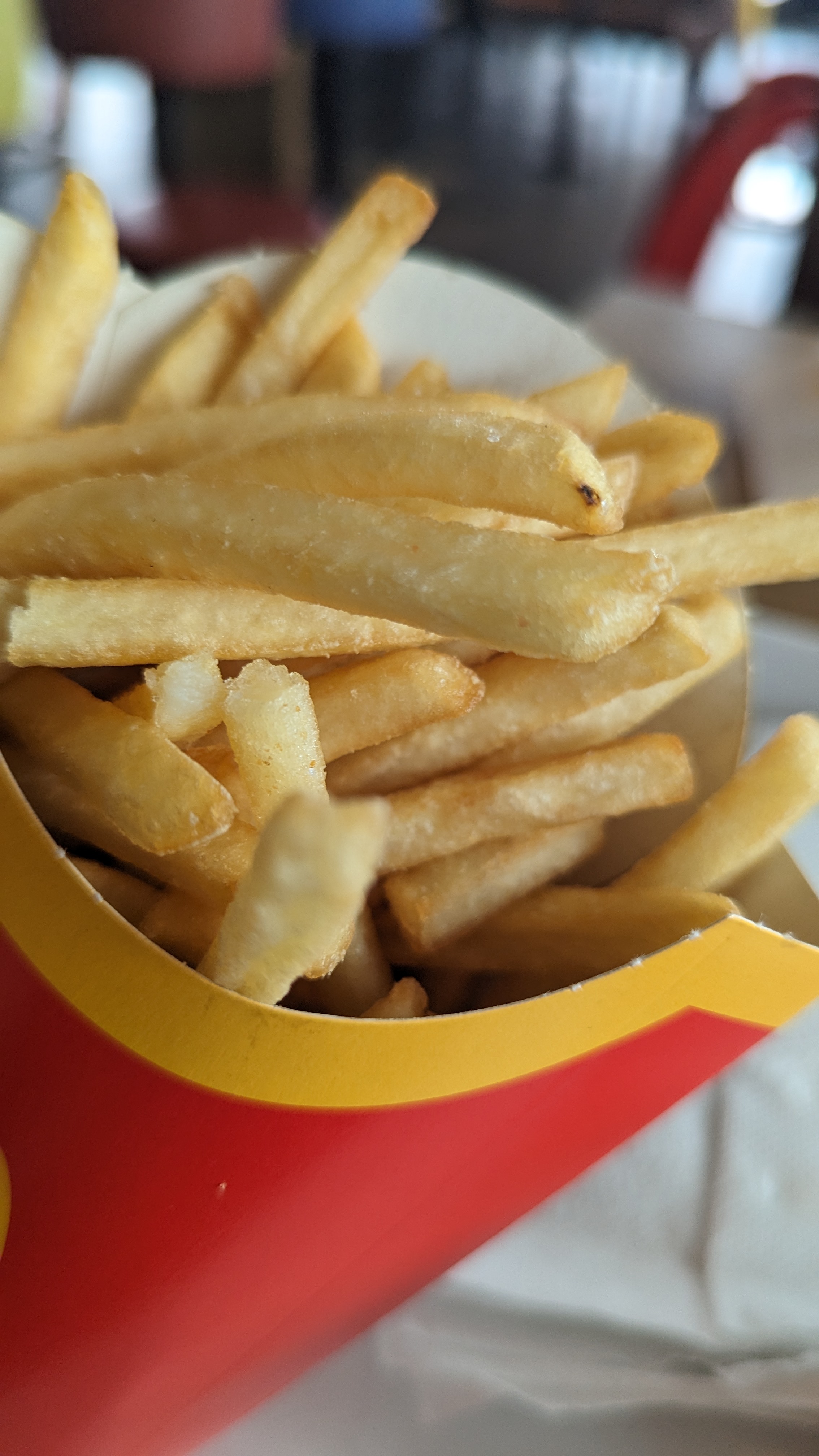 On était sur de la chips de frites 😂😂, doublement cuite. Bref ni fait ni à faire, j'avais zappé qu'il fallait carrément goûter les produits sur place afin de s'assurer que les frites à 4 balles sont correctement cuites. Idem pour les nuggets. Pas sympa du tout ce genre de mauvaise surprise en arrivant chez soi. Ayant appelé, aucune réponse, Suis repassé le lendemain matin à 10h17 histoire d'en discuter de vive voix, macdo fermé et pas même un équipier a l'intérieur alors que c'est écrit ouvert à 10h. Ça fait beaucoup 😂 Bref ça finit en strike sur Google. Cordialement.