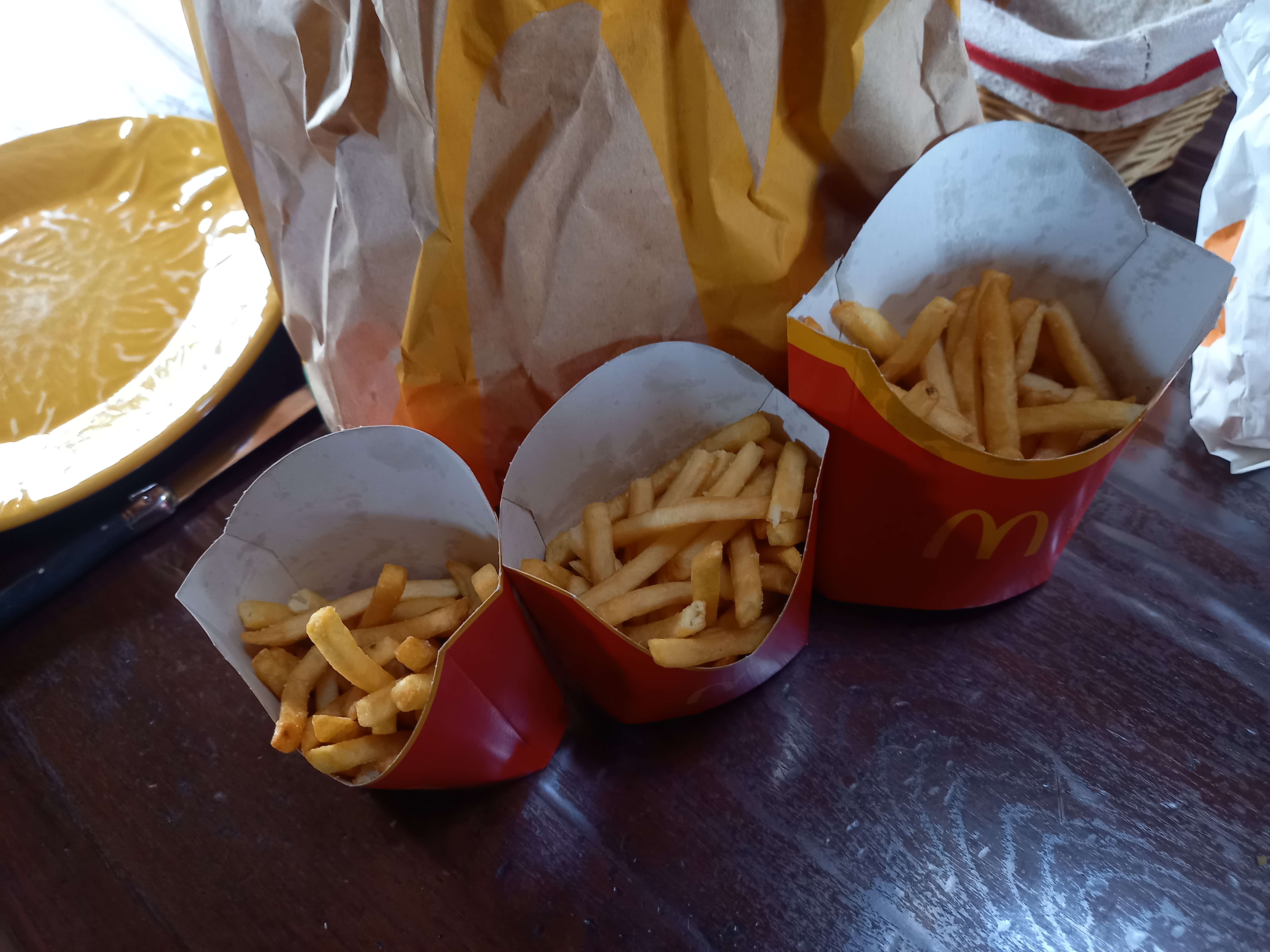 Menu maxi et menu normal. En arrivant j ai l impression que le frite max est très peu rempli. Je vérifie sur la balance (avec carton emballage). Frites max = 111g, frite moyenne = 116g et l autre 93 g !!!!. Comment expliquer ça. A grande échelle ça devient du vol. Vivement un contrôle de cet établissement. J ai regarder sur le site. Normalement frite max = 150g....moyenne = 114g et petite = 80g. A moins que les règles soient différentes. Dans tous les cas, la moyenne plus petite que la grande c est du vol.