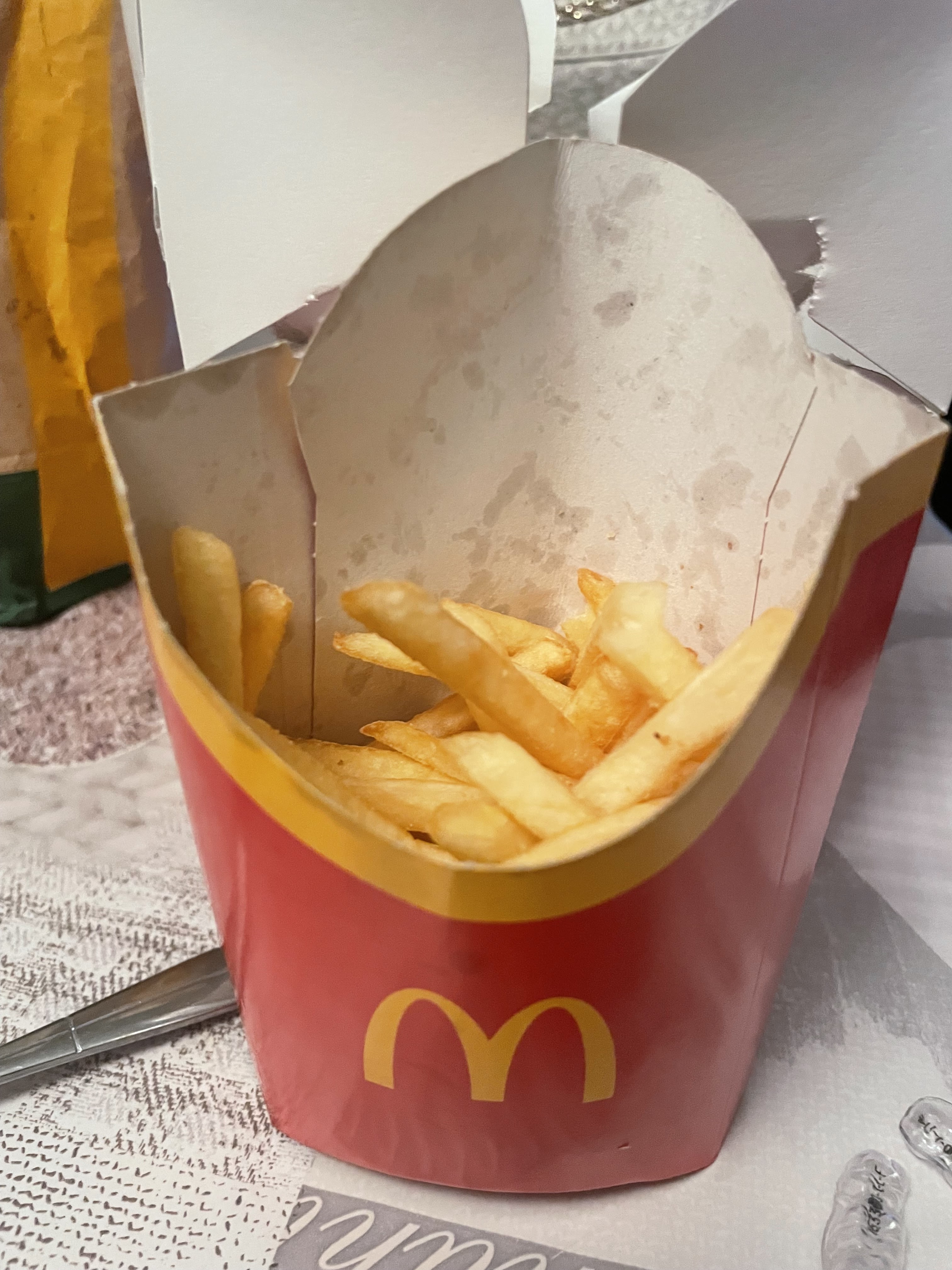 Scandaleux . Habitant à côté , je prends souvent à emporter. cela fait maintenant 1 an voir plus, qu ils ne remplissent plus les paquets de grandes frites. C est honteux. Surtout que je ne pense pas que ça soit ce qui vous coûte le + cher! photos prises lors de différentes commandes. heureusement que ce n est pas le cas dans tous les,autres mcdo.