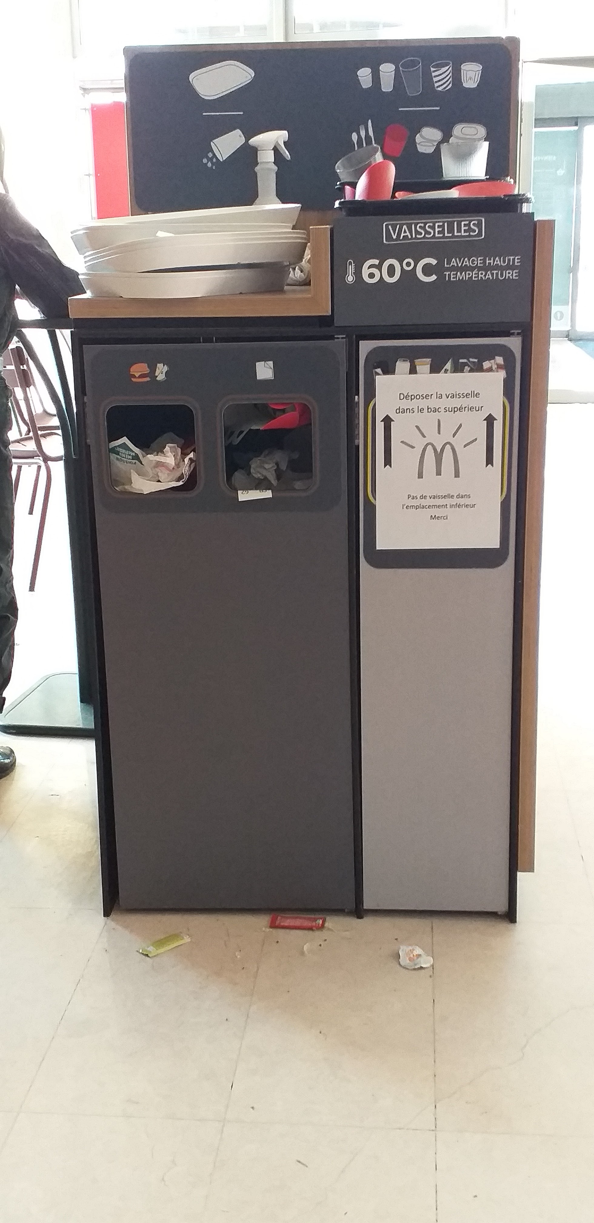 Gros problème d'hygiène, rares sont les tables nettoyées. Problème dans la commande aussi, ils ont réussis à devoir revenir 3 fois pour nous servir le repas complet en oubliant à chaque fois des trucs comme si c'était la première fois qu'ils travaillaient. Bien sûr nous avons ete servis dans des plateaux même pas nettoyés, quand on a sur un plateau des boissons je me demande comment des feuilles de salade sont arrivées jusque là. Je ne veut même pas voir comment ils nettoiyent la vaisselle réutilisable. Et vu les autres avis, la chaîne MC Donald devrait vraiment se pencher sur l'équipe de ce dernier car rien ne va ! En photo des preuves de ce non nettoyage.