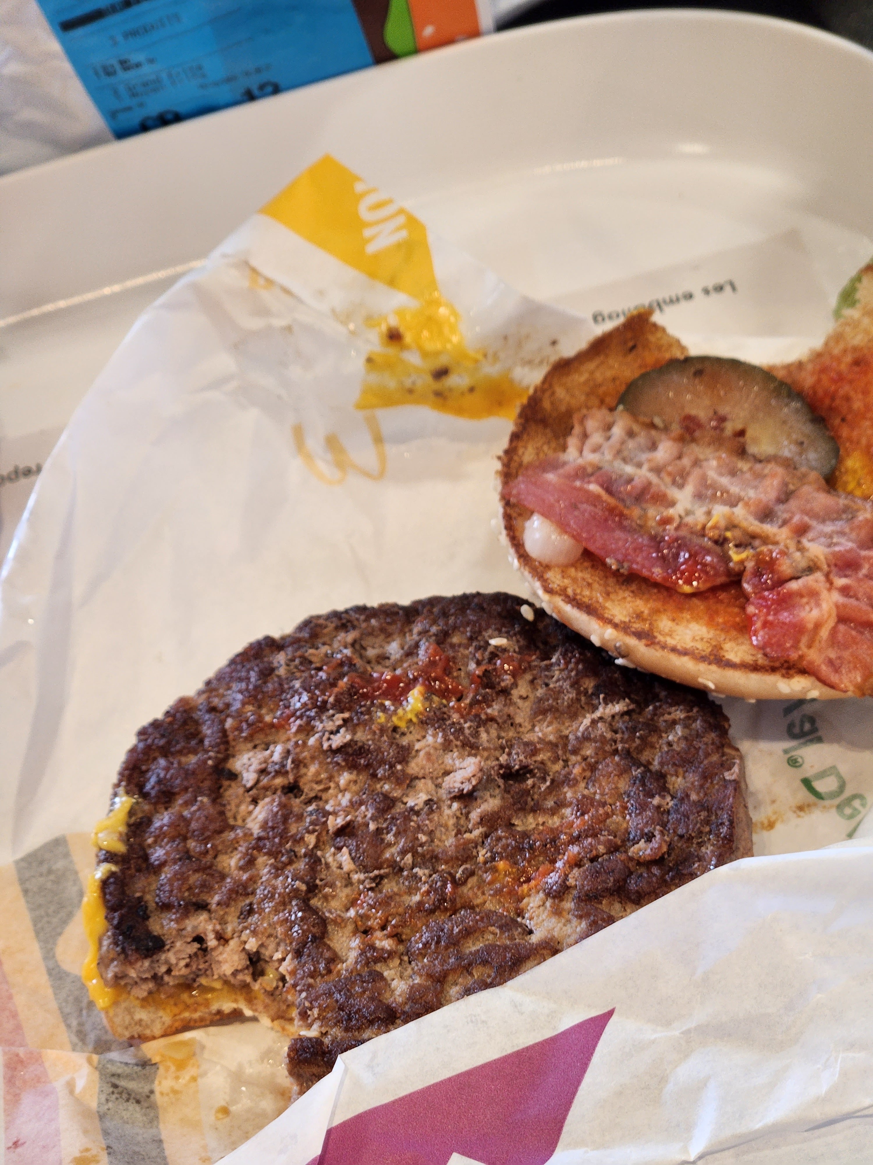 Je sais bien que le photos ne sont jamais contractuelles, mais la quand même... Ce sont deux morceaux de pain avec un steak et un malheureux bout de bacon... 🙄 🙄 🙄 L avantage de la situation paraît évident, je n avais plus faim à l ouverture de l emballage...