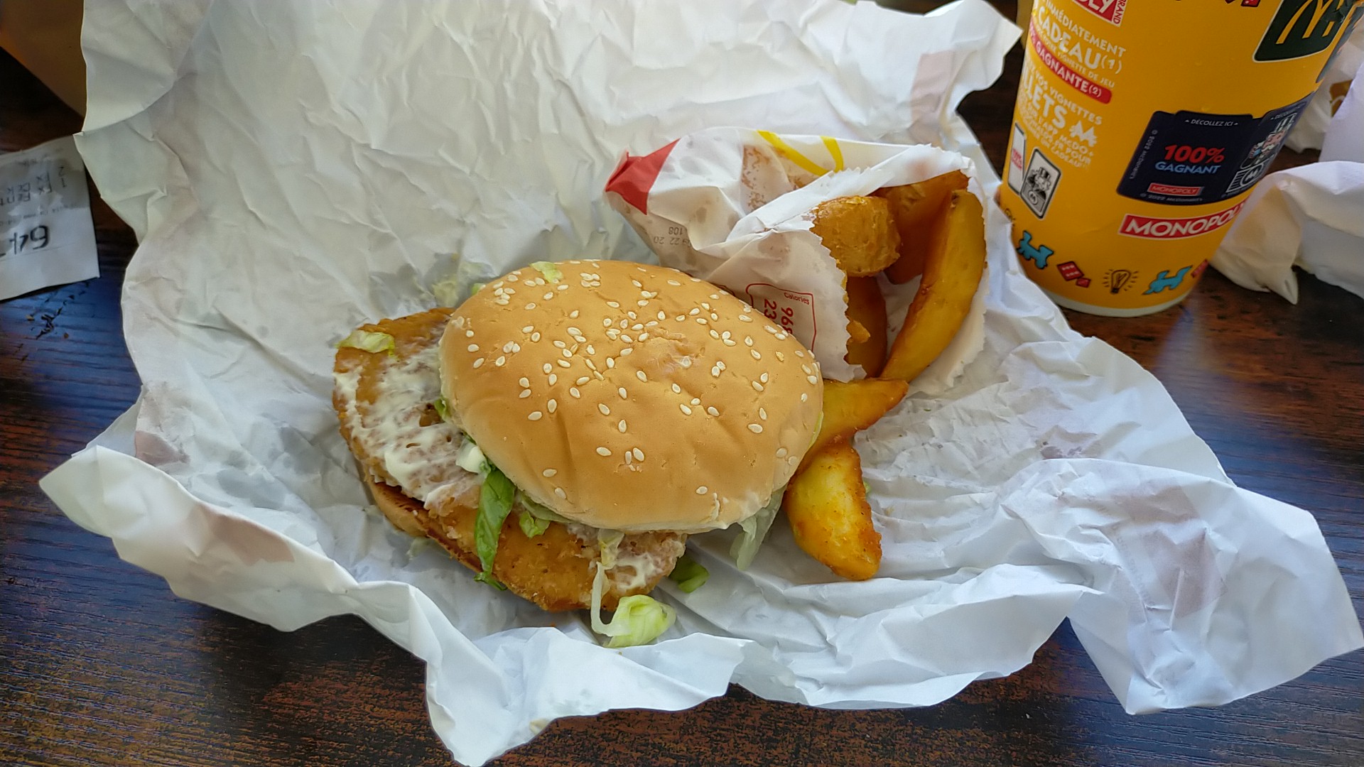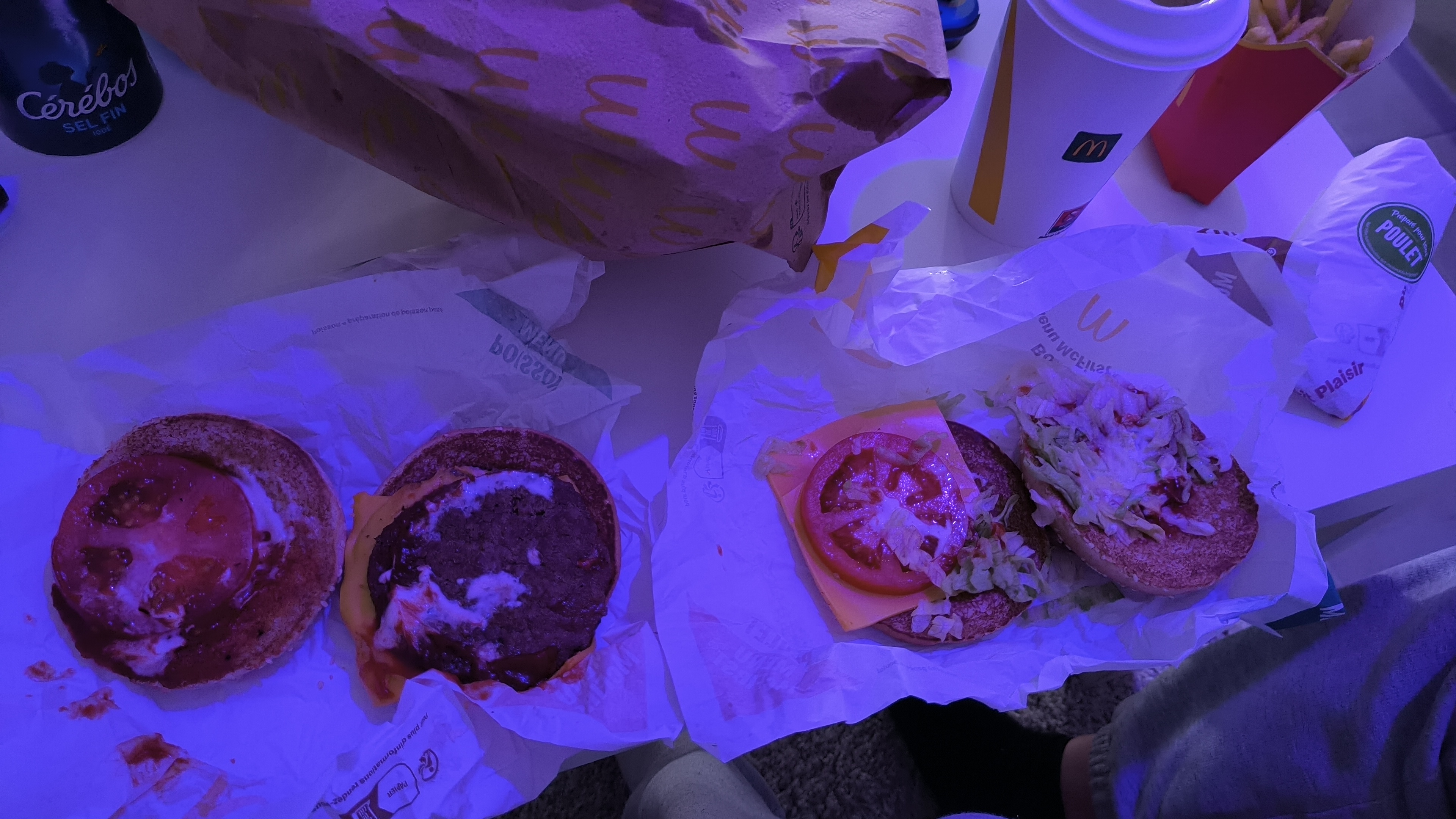 Je crois qu’on nous a mangé la moitié de nos frites et bu un quart de nos boissons. La prochaine fois on prendra un Happy Meal, on aura les mêmes quantités.