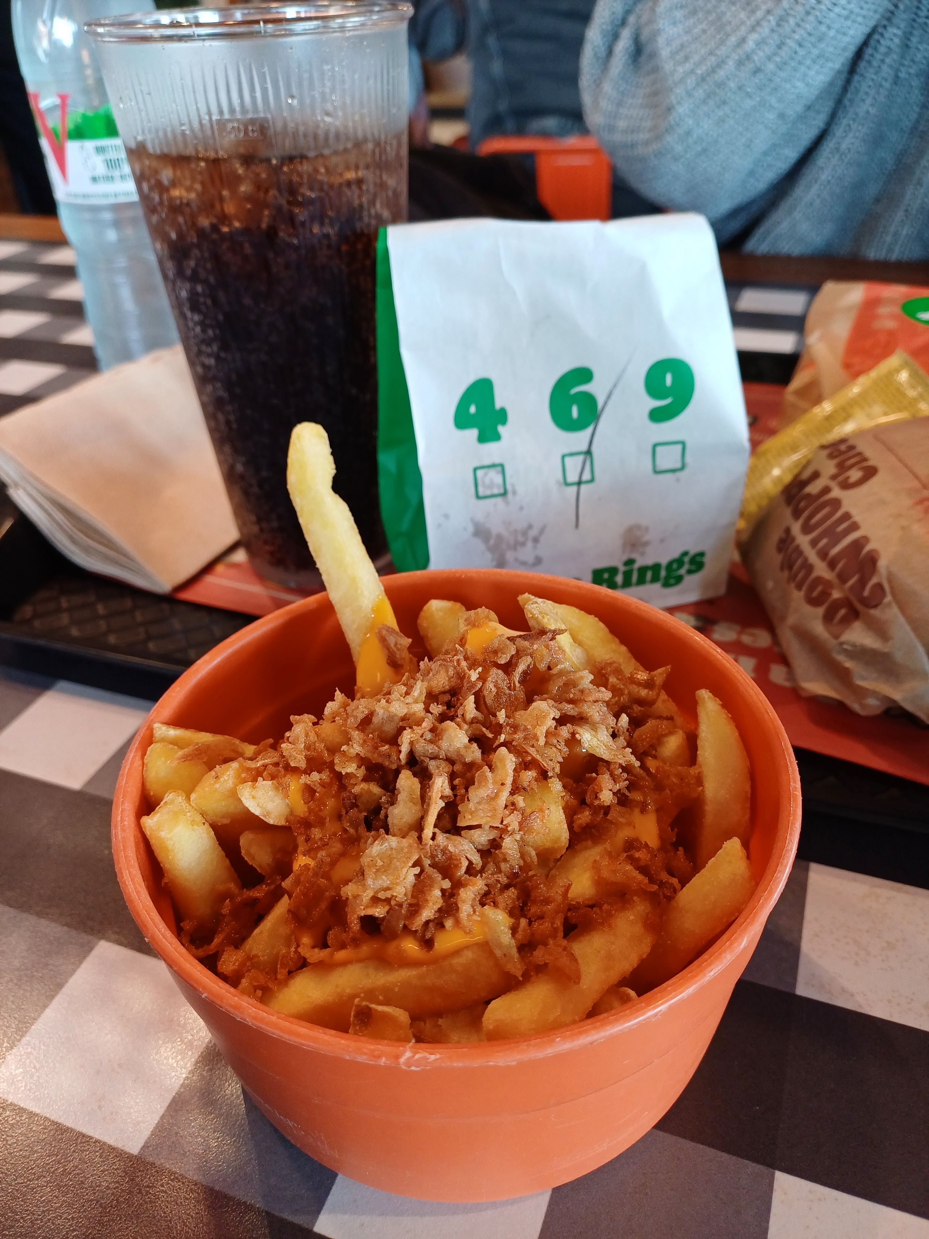 Tout était froid, le burger pas bon et les frites toutes petites et pâteuses, on aurait dit que ça avait traîné. Je prends ce menu habituellement à emporter et après plus de 10 km c'est plus chaud et meilleurs !