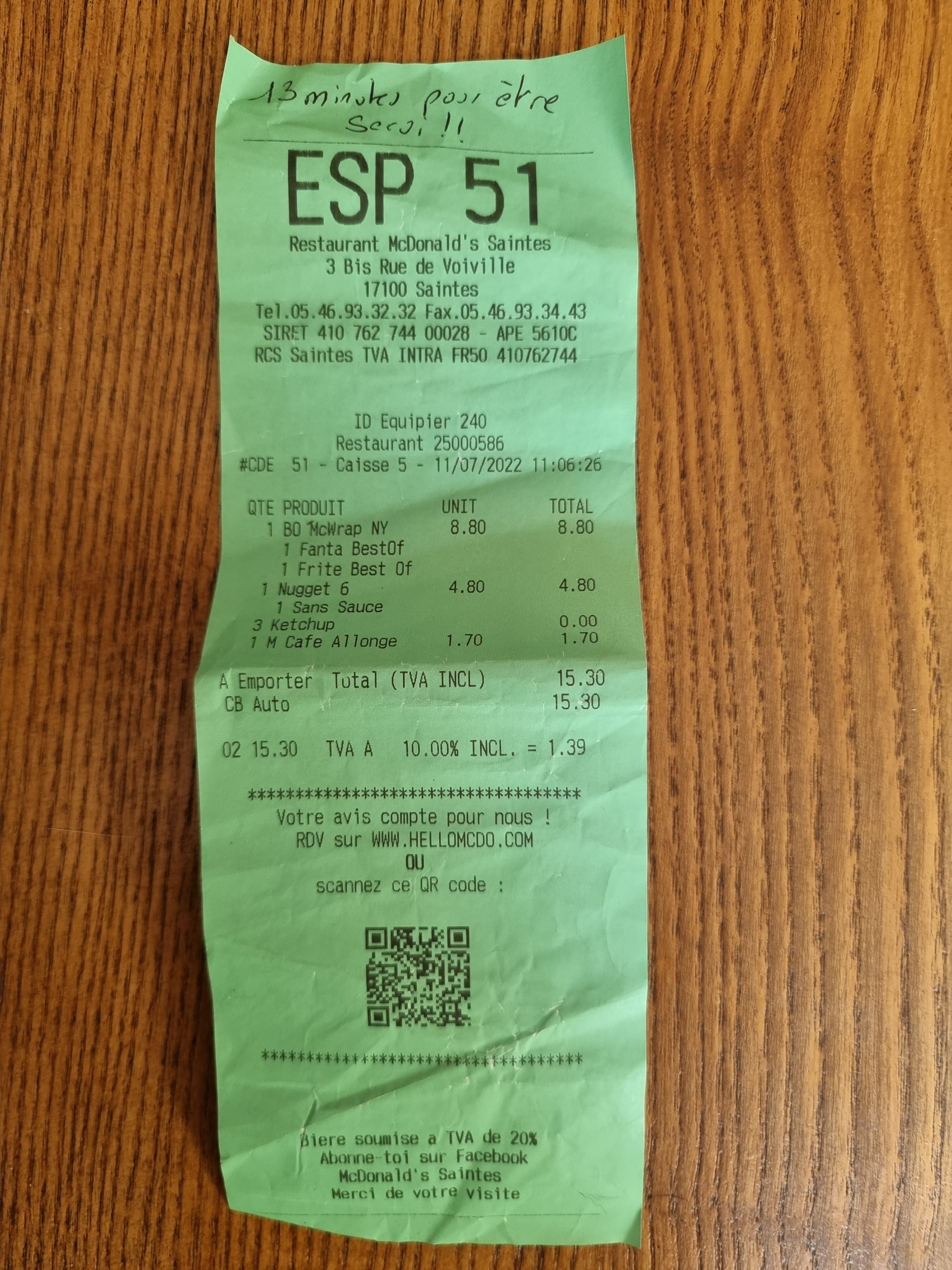 A emporter Lundi 11 juillet 2022 en caisse à 11h06 De passage en provenance du bassin d'Arcachon Lège-Cap-Ferret je me suis arrêté à ce Mcdo pour une pause repas Concernant l'accueil rien à dire seul bémol, ma commande était composé d d'un menu Best of Wrap frite boisson plus un café . Un lundi matin hors gros week-end, hors depart en vacances 11h06 passage en caisse j'ai attendu 13 minutes pour avoir ma commande je crains le pire sur un gros week-end ou sur des créneaux horaires plus chargés A titre de comparaison de retour sur mon lieu d'habitation je suis allé au MC do d'Arès 33740 le 15 juillet à 12h23 avec en commande 3 gros Burger différents, 3 grandes frites ,5 minutes pour avoir ma commande sans commentaire !..............