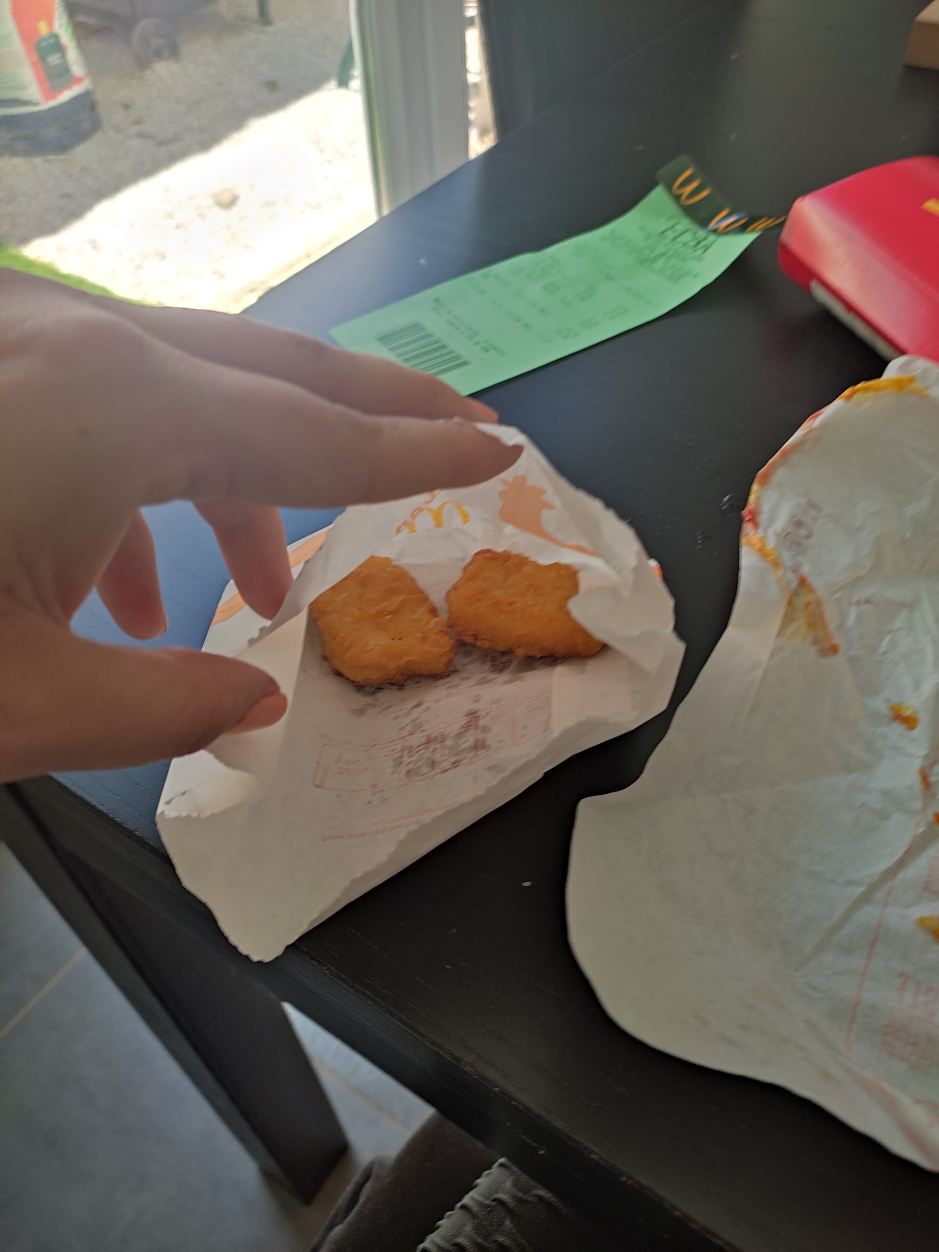 La qualité des produits est en déclin depuis quelques temps... Il n'y a qu'à voir les photos... Le burgers est a moitié dans l'emballage et seulement 2 nuggets dans mon sachet de 4... C'est vraiment de pire en pire Je n'ai pas l'habitude de publier des avis négatifs mais là c'est trop ! Ce n'est pas la première fois que les sandwich sont vraiment minable et ça c'est quand il ne manque rien a la commande ! Bref je continuerais à y aller pck c'est a côté mais la qualité du service devrait être revu
