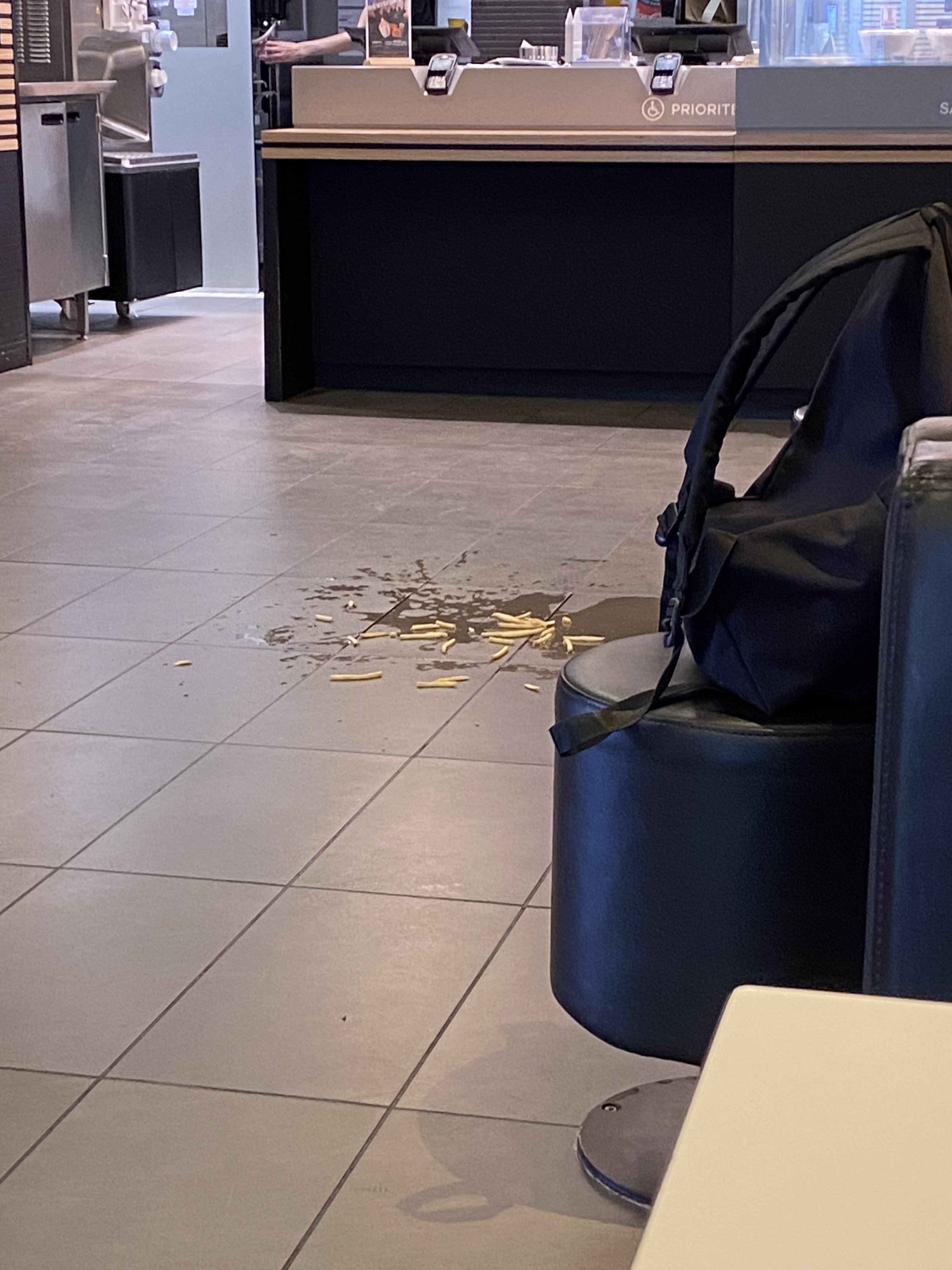 Cela fait 15 minutes que je suis là. Toujours pas eu ma commande. Des frites et de la boisson sont sur le sol depuis moi arrivée et personne ne semble s’en soucier… cela reste par terre. Bref rien de très bien !