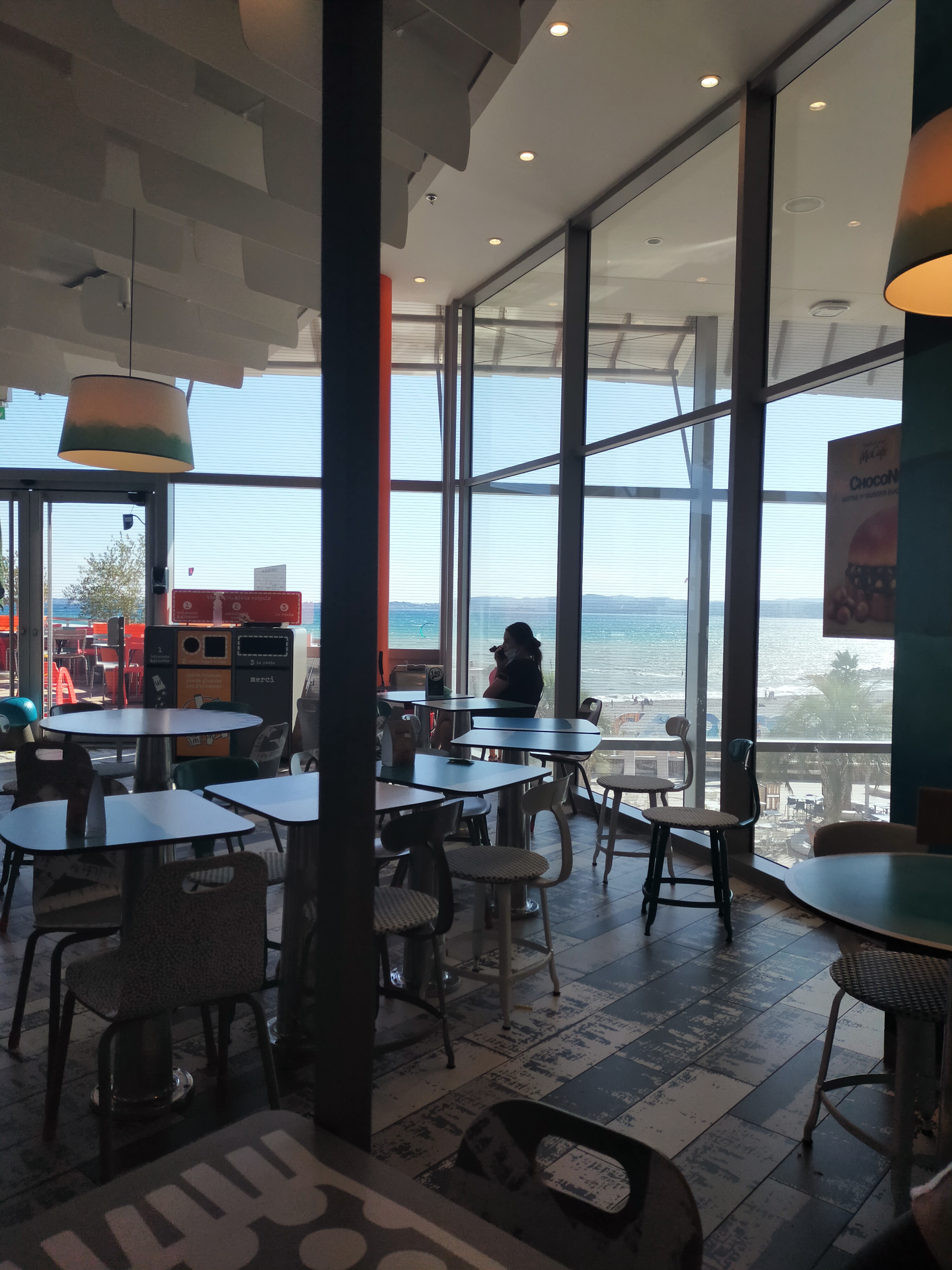Un mc donald mais avec une terrasse et une vue magnifique sur la mer et les collines @!! Top !!!