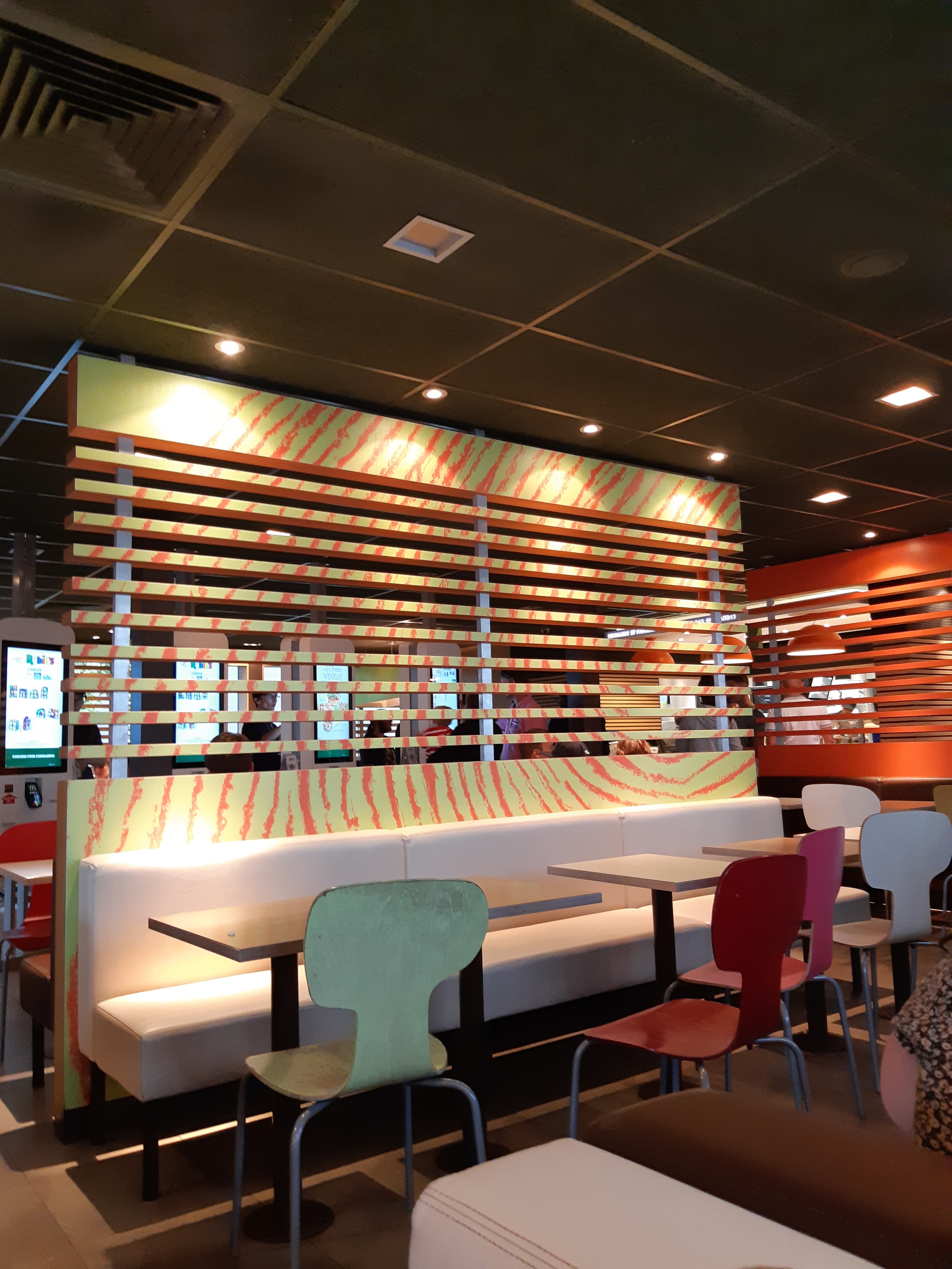 Pas très beau et assez sale.... Les poubelle sont toujours pleins. Par contre le service est très agréable et tout le monde est serviable. Il devrait vraiment moderniser la salle intérieure. Par contre la terrasse et couverte est fermé donc top pour l'hiver. Dommage aussi que les pauvres salariés sont obligés de crier le numéro de la commande pour le service à table...ça permet pas de se détendre. Après ça reste un Mcdo, donc rien à dire sur les menus.