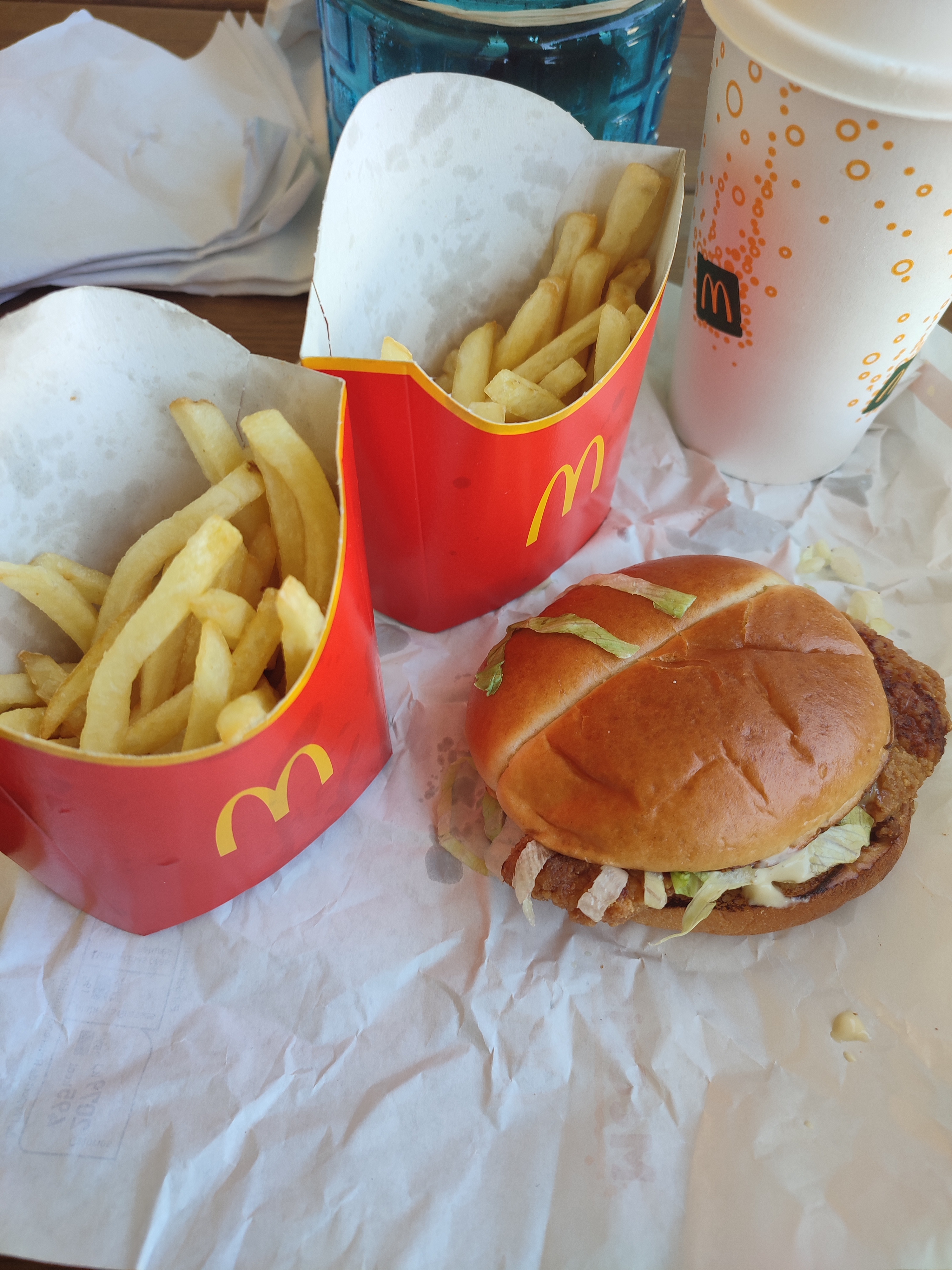 Encore une erreur sur les menus commandés, sunday chocolat au lieu de caramel 😞,mc first poulet commandé bœuf 😡 Frites de légumes froides et extrêmement grasses. Pas de serviettes pour une commande en drive 😕. Bref, cumul ça devient pénible.