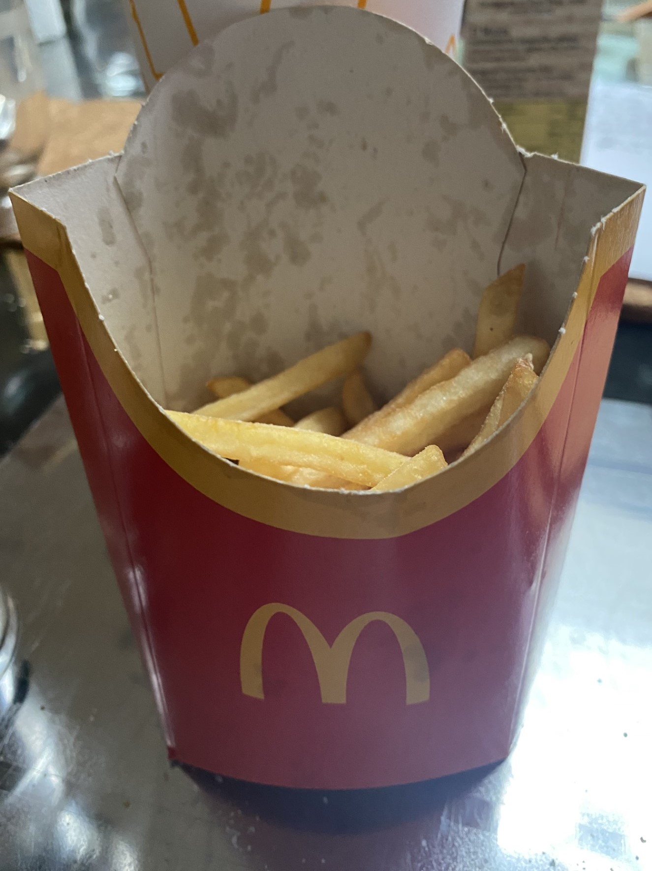 La grande fritte pour laquelle j'ai payé le prix fort en achetant le menu MAXI BEST OF (le 01 mai 2024 à 20h05 en livraison U. eats) m'a été livrée quasiment vide ! à ce niveau là c'est une honte et ça s'appelle du vol ! Et je ne parle pas des cocas jamais remplis correctement... C'est vraiment se moquer des gens et irrespectueux !