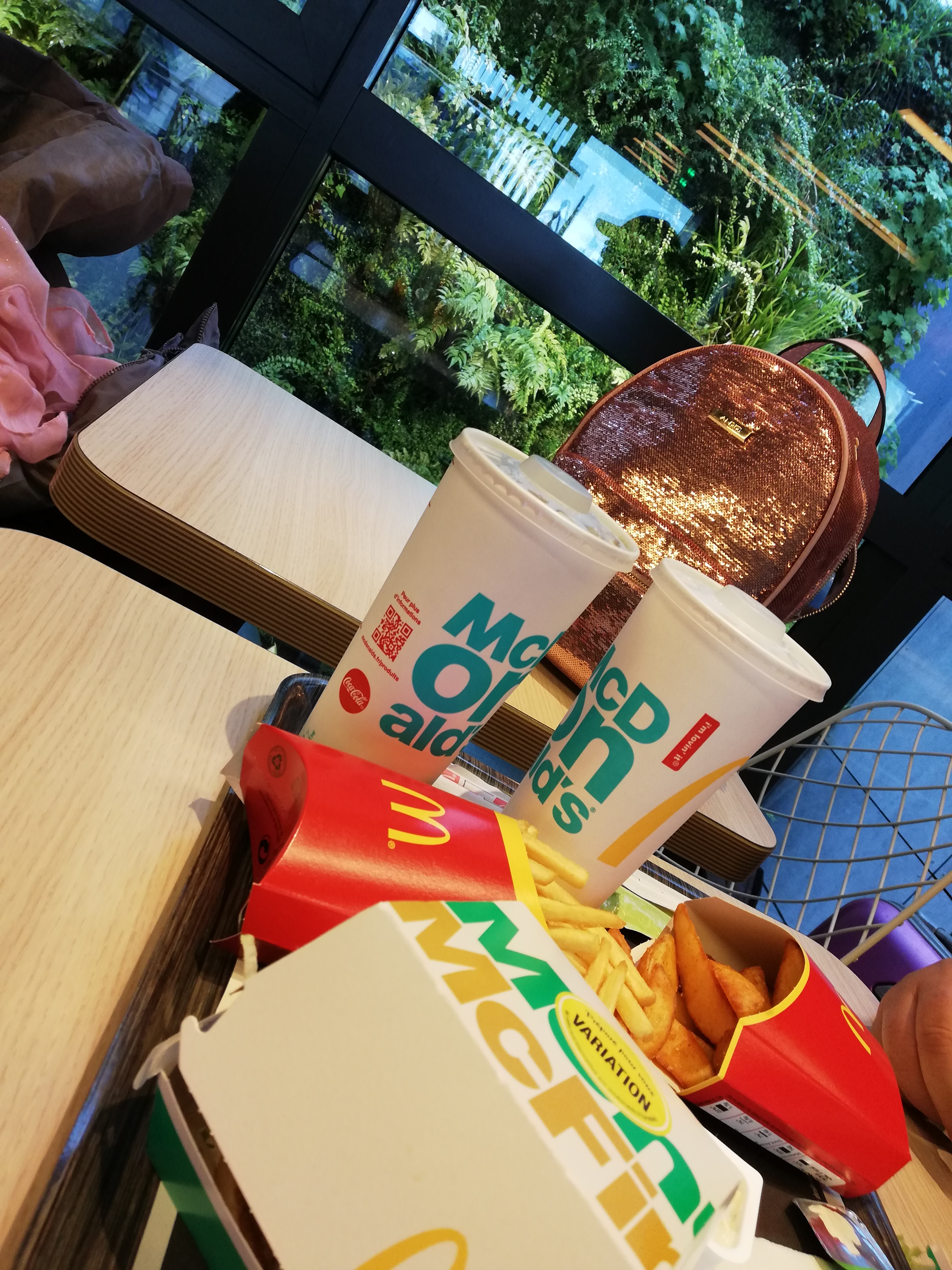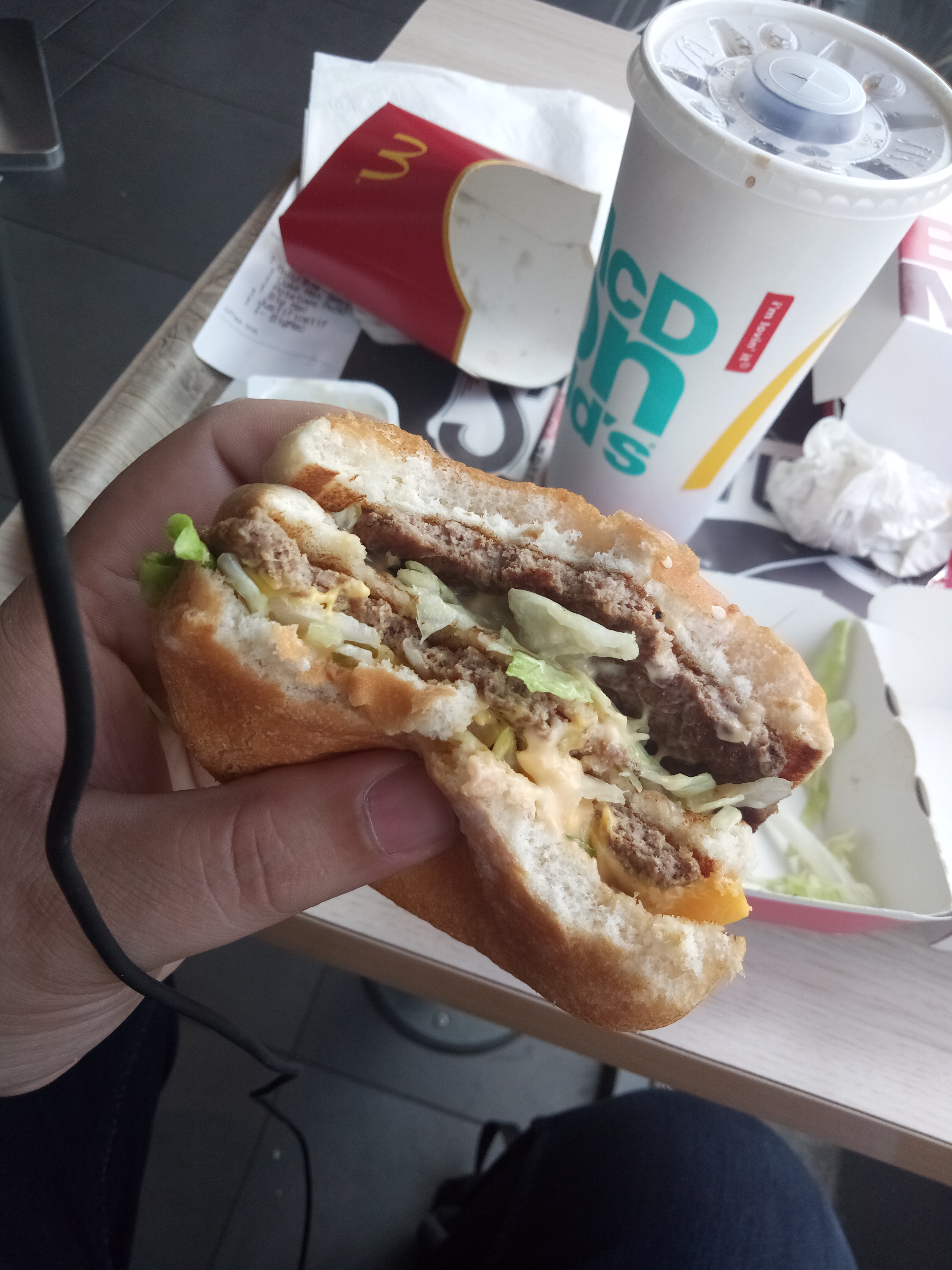 Macdo qui sent presque trop bon Les nuggets étaient très bonnes Les frites un peu froides Presque pas assez d’eau dans le coca Bonne ambiance mais le dj a du mal à se décider sur l’ambiance qu’il veut mettre On recommande quand même