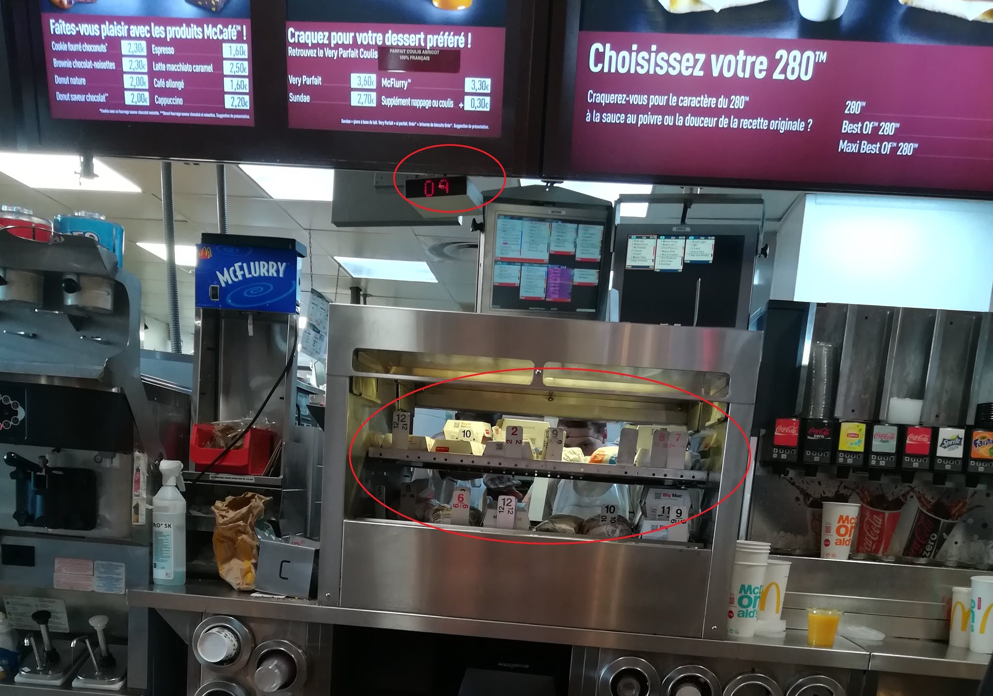 Si vous aimez les hamburgers plats (car restés trop longtemps dans le bin (bin = la partie en inox où sont rechauffés les hamburgers)), la salade cuite, les frites froides, vous y trouverez votre compte Sur la photo prise ce midi en plein rush, on voit qu'ils servent des hamburgers qui auraient du être jetés depuis longtemps :L'écran en haut est à 9, ce qui signifie que les hamburgers avec un timer (timer = plaque en acier avec un numéro dans le bin) inférieur à 9 auraient du être jetés. Celui qui a un timer égal à 2 aurait du être jeté depuis + de 30 minutes. Lorsque j'ai demandé à l'équipière de me donner un autre hamburger car celui qu'elle m'a donné aurait du être jeté depuis + 15 minutes, elle enlève le timer et me dit qu'il y a une erreur sur les timers. Un restaurant où ils sont aussi soucieux de leurs clients que de ce qu'ils servent. A éviter