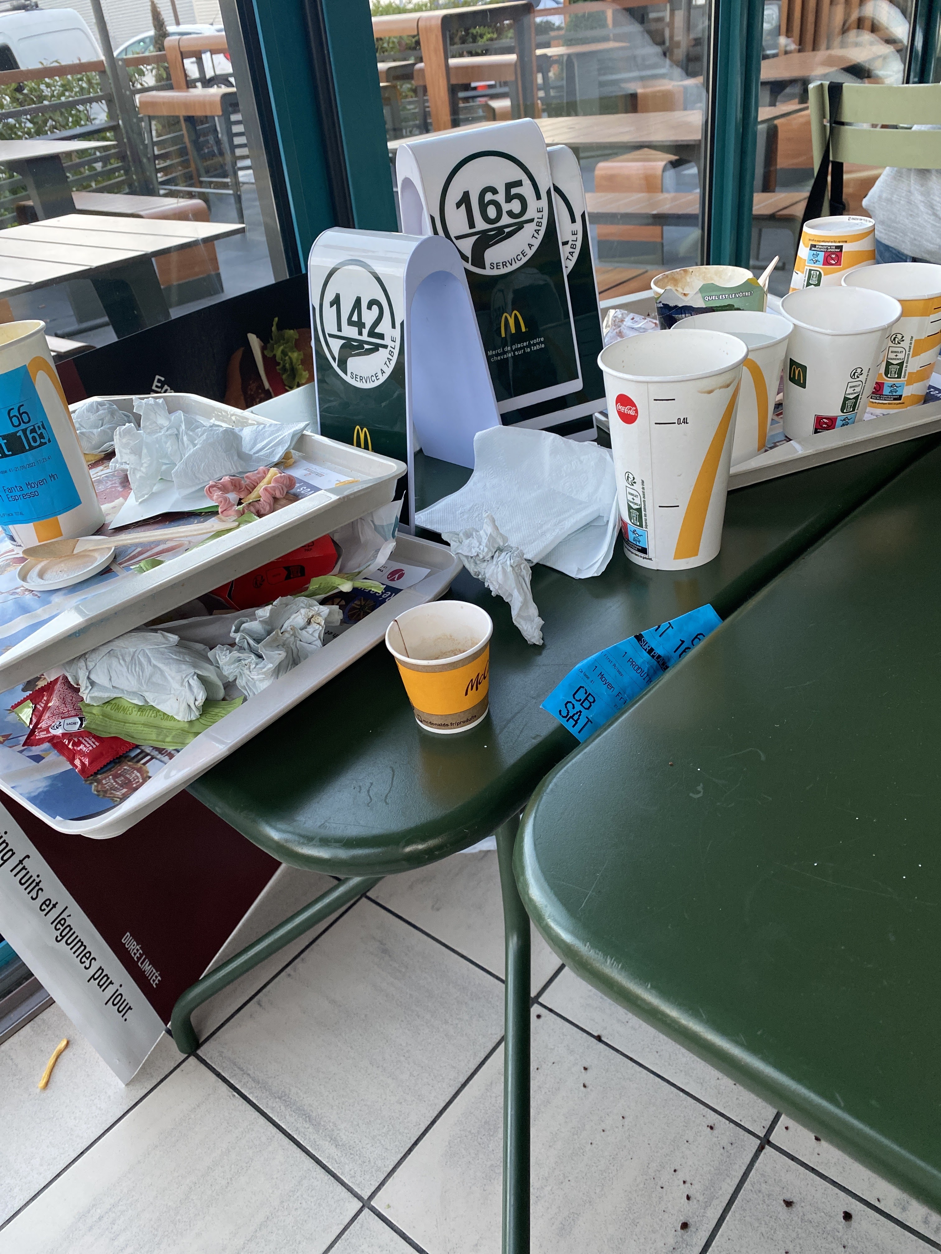 Vraiment très sale,table même pas débarrasser , très déçu quand je lis la plupart des commentaires, ils sont très négatif. Je ne comprends pas pourquoi la direction du groupe. McDonald’s ne fais pas quelque chose.