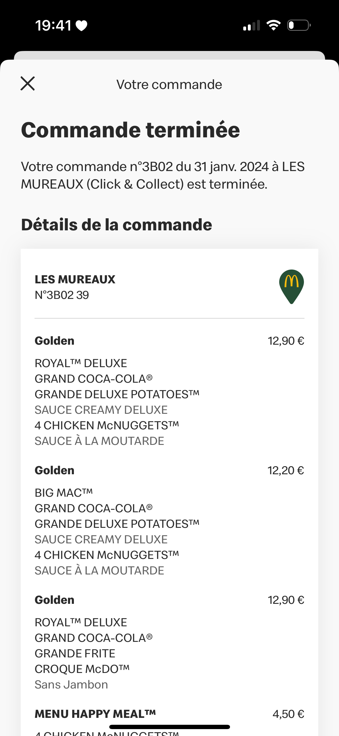 Achat via l'application et click and collect sur le parking. Encore une fois commande incomplète, alors qu'il y avait 2 menus et 2 desserts seulement. Ça ne valait pas le coût d'y retourner cela m'aurait coûté plus cher en essence et en temps, 2€50 de perdu....