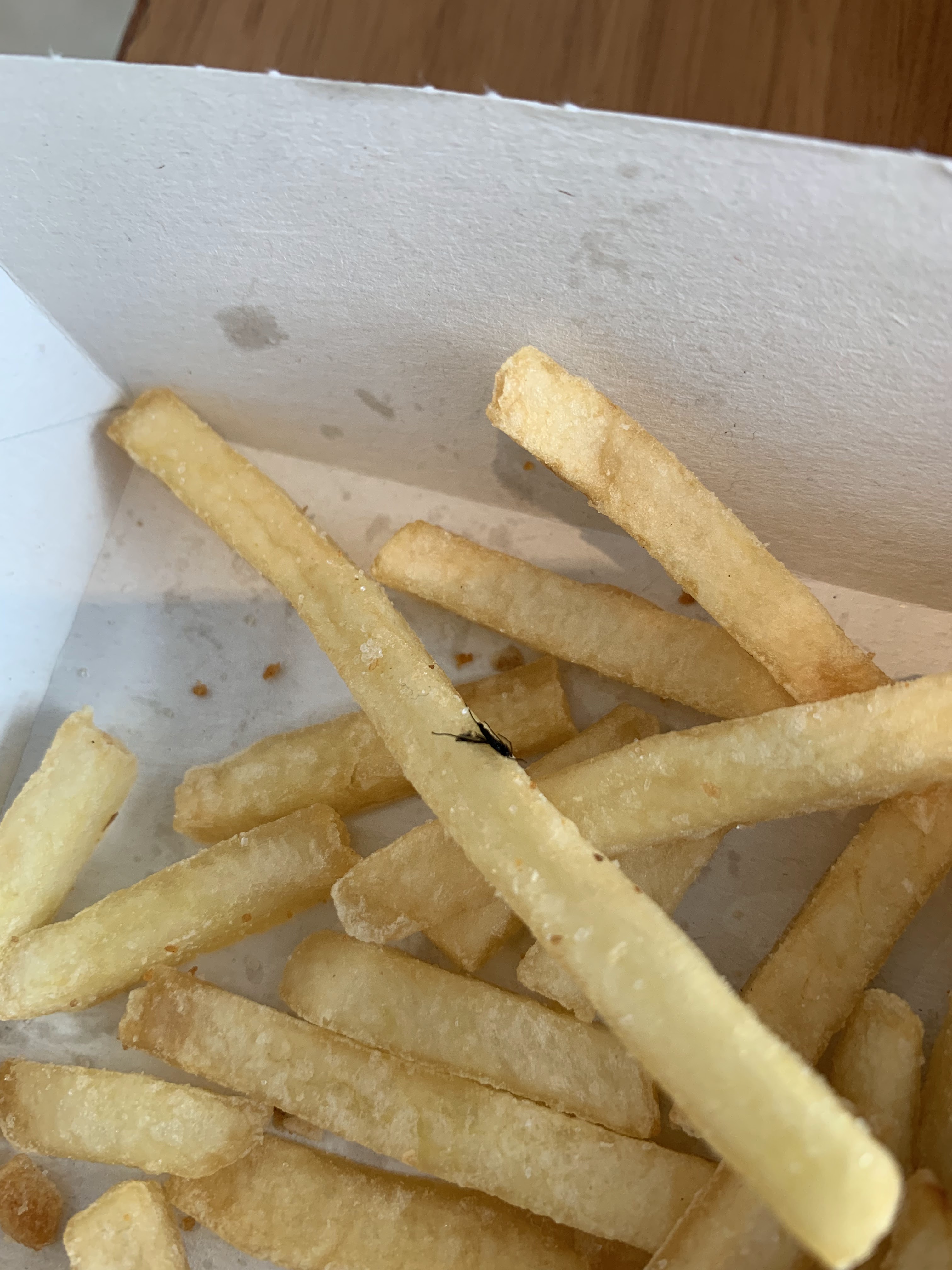 Repas avec ma fille...gâché car frites glacées !! Quand je descends pour les rendre et en réclamer des chaudes, la personne me fait clairement la gu** (ce qui est un comble !!) et me regarde avec dédain !!??? Et lorsque nous arrivons au fond du paquet de frites, voilà ce que nous trouvons : quelque chose qui ressemble à un moustique qui se serait fait cramer à la friture ! On arrête donc de manger, dégoutées...:( En partant, je montre la chose à la responsable qui s'en fichait royal car elle finissait son service (sac sur l'épaule !) : elle m'a donc répondu, lasse je pense que c'est plutôt un bout de tissu, la blague !!!! Car un bout de tissu est moins grave qu'un moustique madame !!???? La première chose était de s'excuser, ce qu'elle n'a pas fait, juste proposer de nouvelles frites, ce que nous avons refusé vu que nous aussi on sortait !! Bref, accueil & hygiène déplorables dans ce McDo, ADIEU !!! :(((
