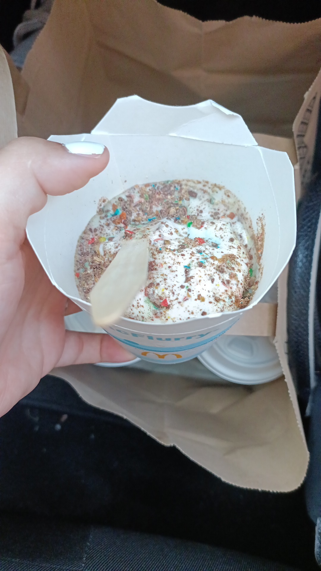 En vérifiant notre commande, je me suis aperçue que le McFlurry était rempli à moitié. Je suis retournée au comptoir pour avoir un peu plus de glace (gentiment et poliment) mais le jeune m'a simplement dit que c'était la norme. Je pense que c'est plutôt se moquer très fortement de la gueule de leurs clients. Donc éviter d'acheter des glaces à 4€ chez eux !!!!
