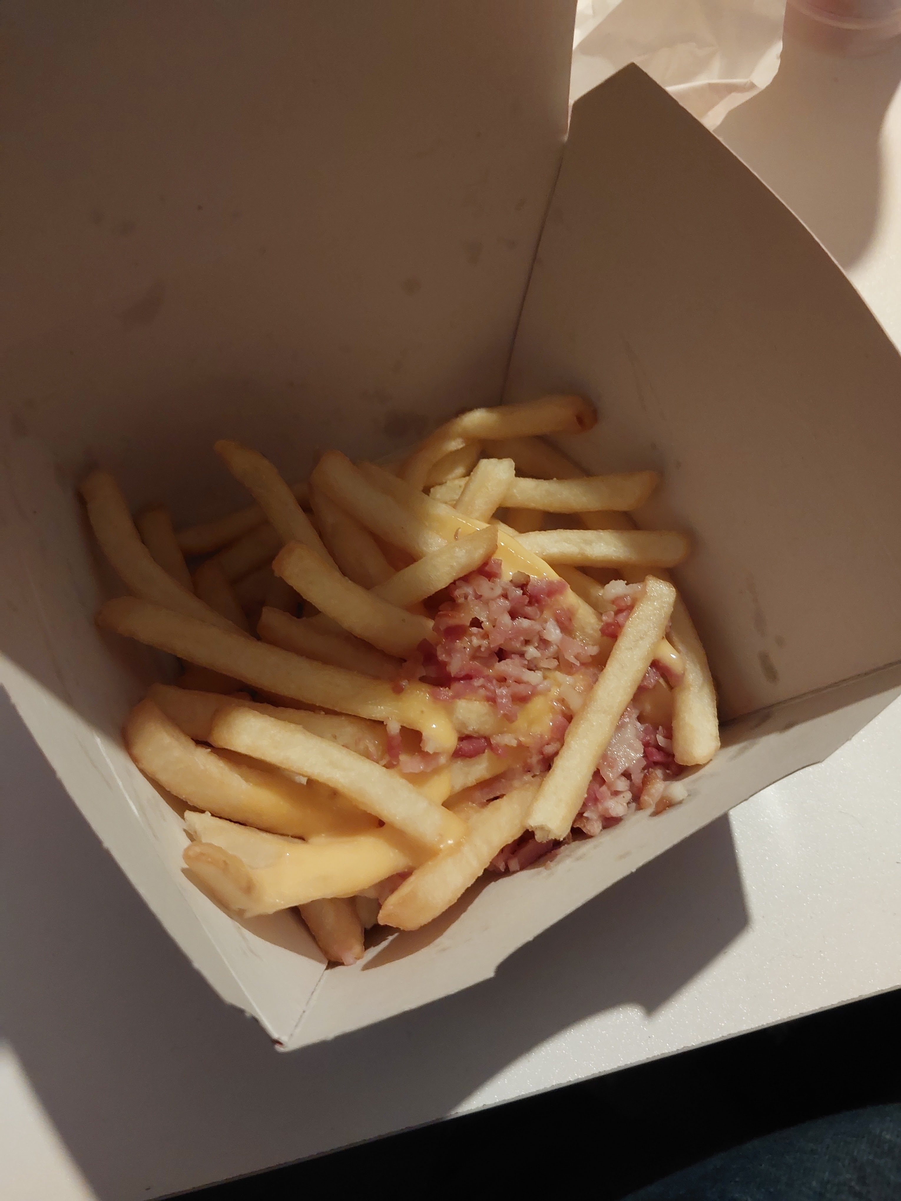 Jai commander des frites bacon cheese j'ai pas eu le bacon dedant le wrap était presque pas cuit ..let le cheesburgeur pareil pas cuit ..