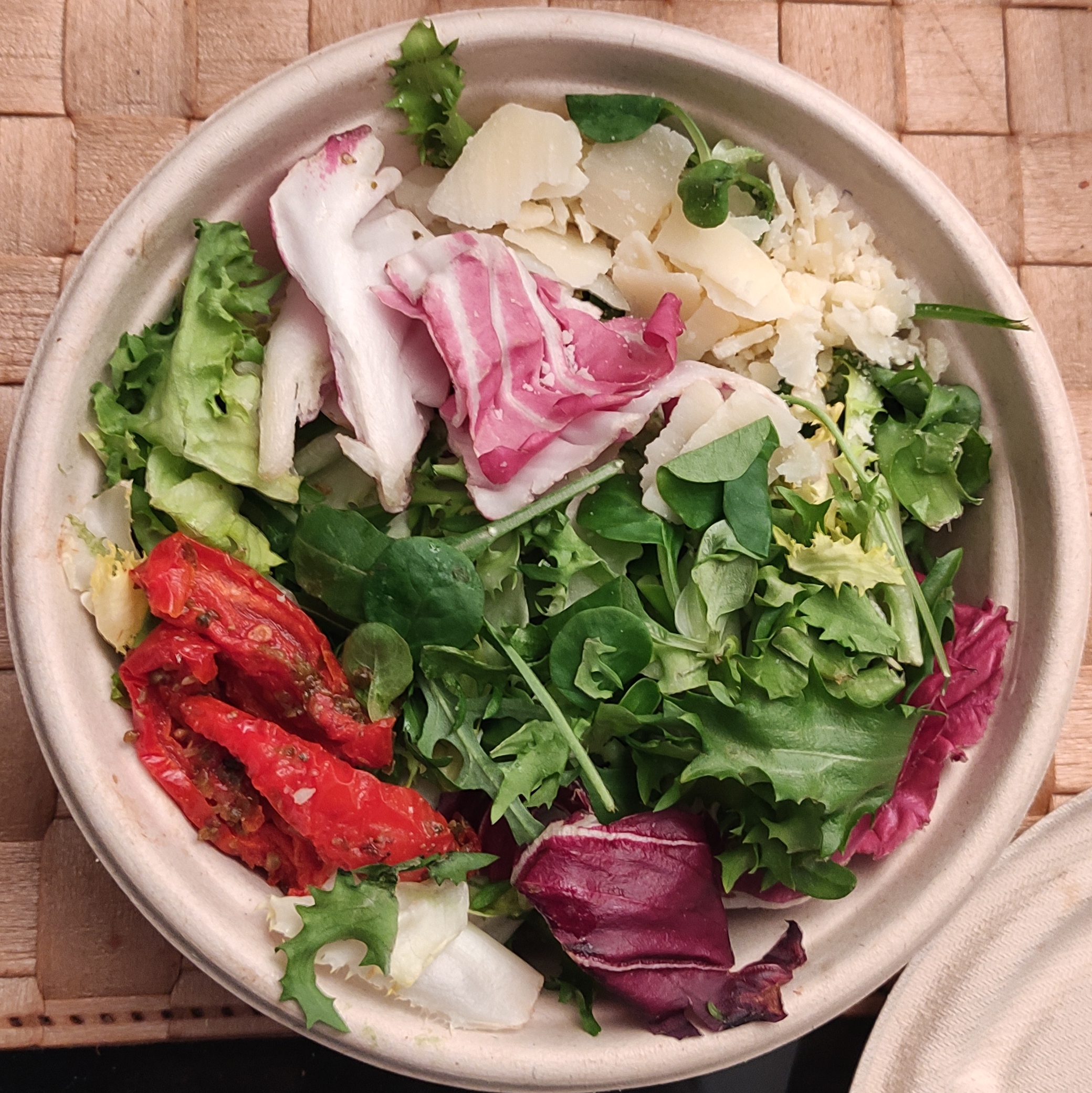La petite salade avec tomates séchées, morceaux de fromage est vraiment très bonne