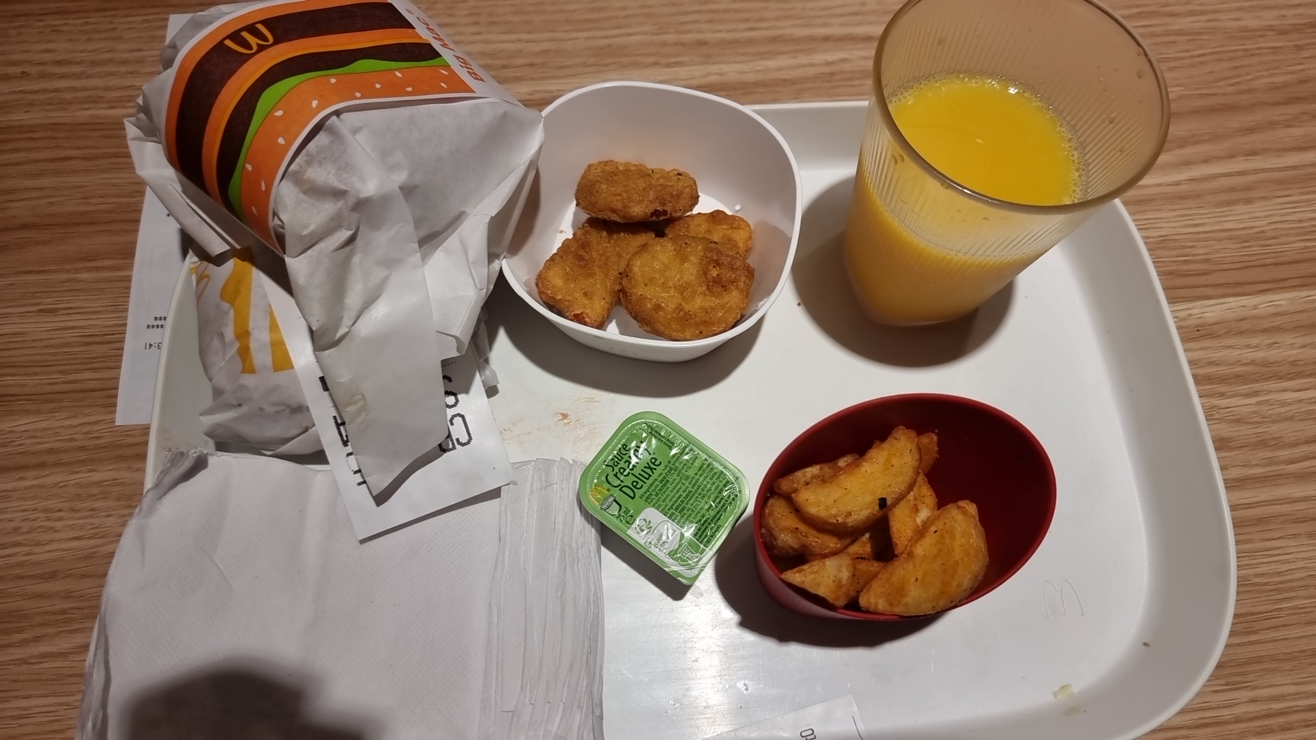 Étonnant qu'il n'y ait aucun produit du moment à la carte (Mc Baguette, wings), ou même certains constants (Big tasty, 280) mais peut-être était-ce dû au fait qu'on était le 1er Janvier. Je me suis rabattue sur un classique Big Mac et des nuggets qui étaient cependant très bons. Nous avons pu expérimenter la nouvelle vaisselle réutilisable, c'est plutôt mignon, on dirait de la vaisselle de dînette pour enfant. Serveurs attentionnés (et courageux de venir travailler un lendemain de 31 Décembre !).