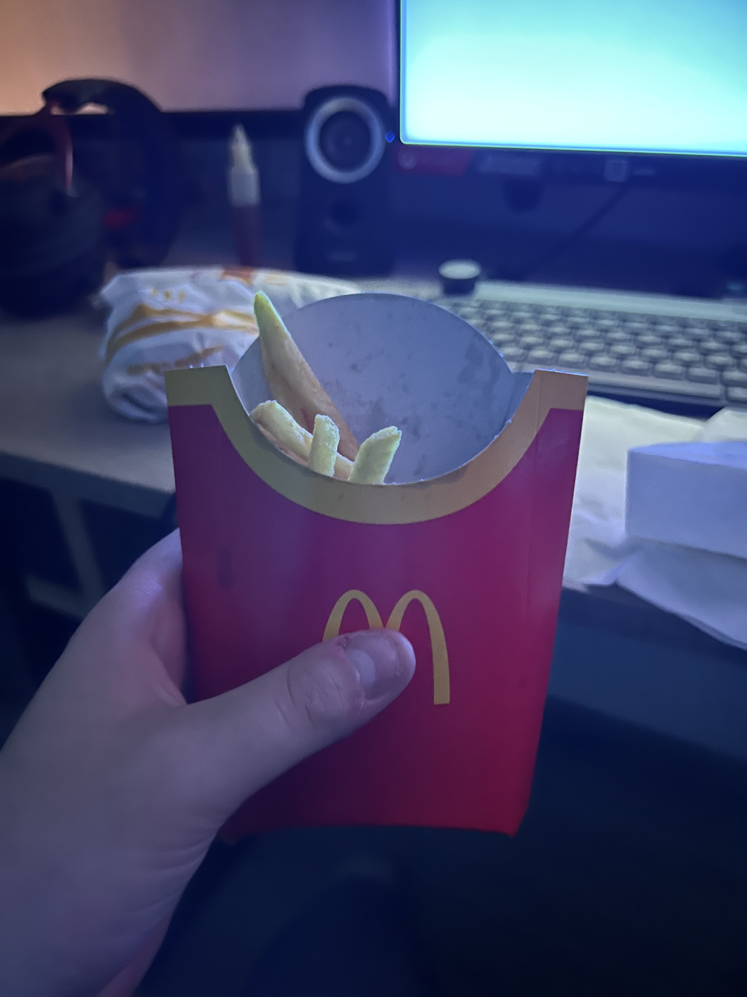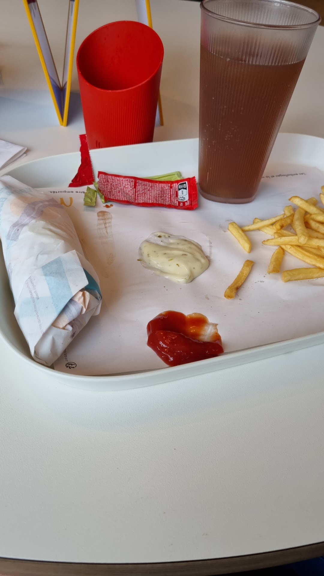 Happy meal = 10 frites qui se battent en duel ! On a bien cherché si elles étaient tombées ailleurs mais non ! Et encore les sauces d’oublier! Ça en devient pénible ! Surtout quand il n’y a pas foule et donc pas de coup de jus ! On le paye ce repas ! Un peu de respect pour le client svp !