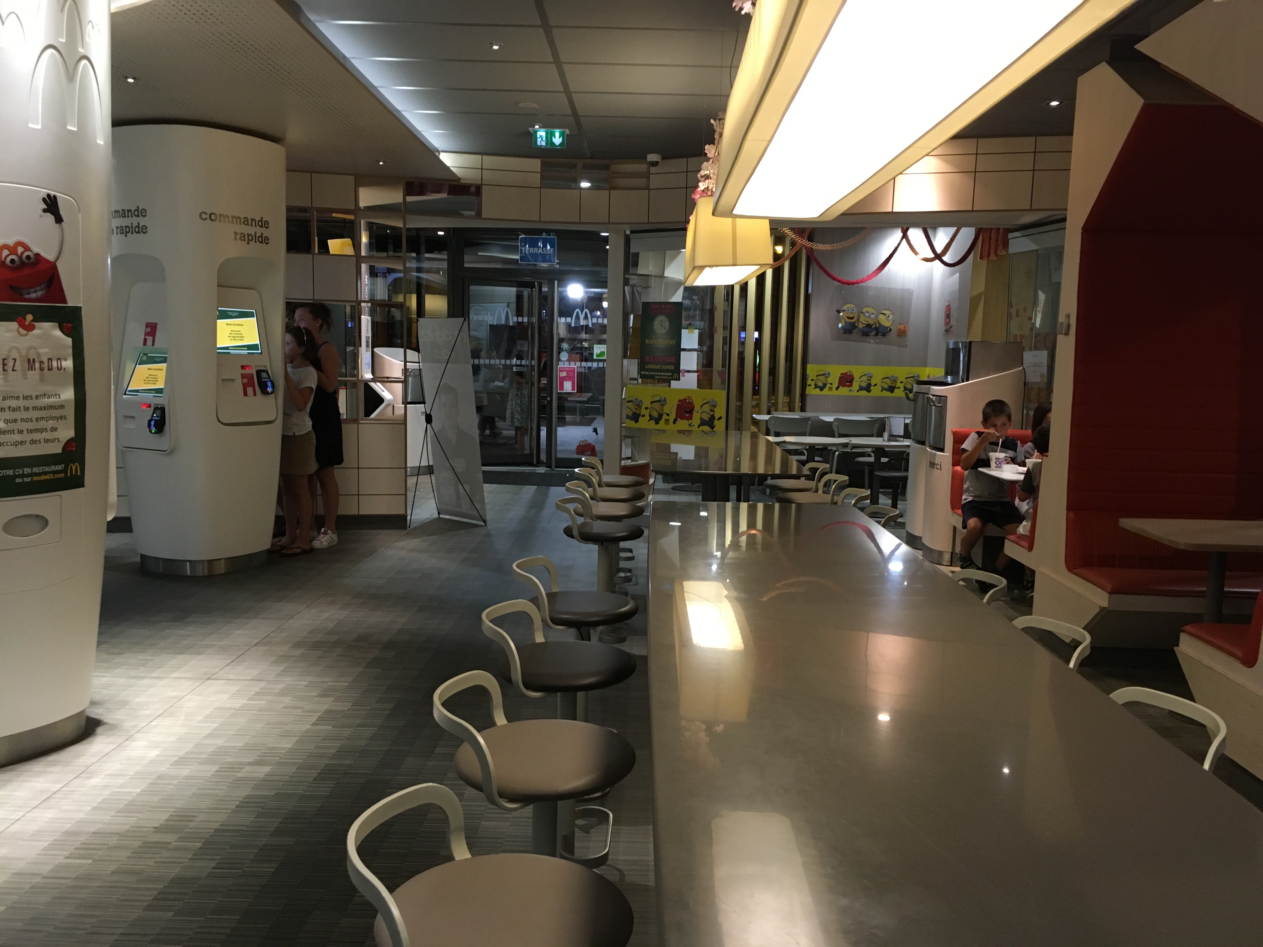 C'est un Mac Do comme beaucoup d'autres, pas de surprise. Mais pourquoi avoir la clim à ce point ? On a mangé à 20h, il faisait 25° dehors, beaucoup de monde mangeait à l'extérieur, plus de places, dommage. À l'intérieur, à peine 20° à mon avis et un courant d'air froid qui vous tombe dessus, très désagréable, à revoir de ce côté là.