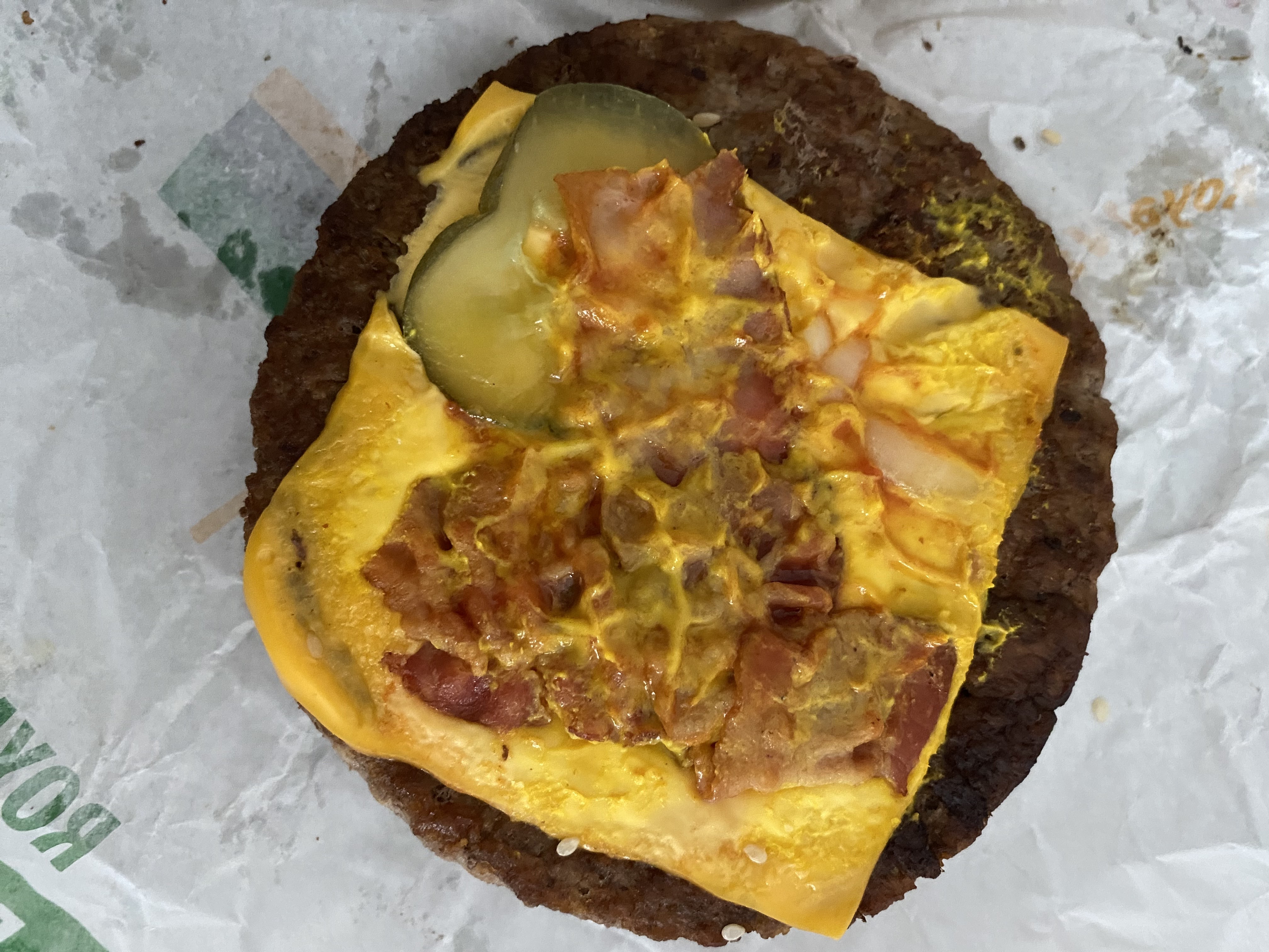 Bonjour, j’ai pris un royal bacon au drive il y a 1 heure mais là c’est vraiment du f0utage de gueule! 6,50 euros pour ça! Un steak tout sec, 1 rondelle de cornichon, le fromage pas fondu et tout sec! Que s’est il passé?!? Mac Do terminé!
