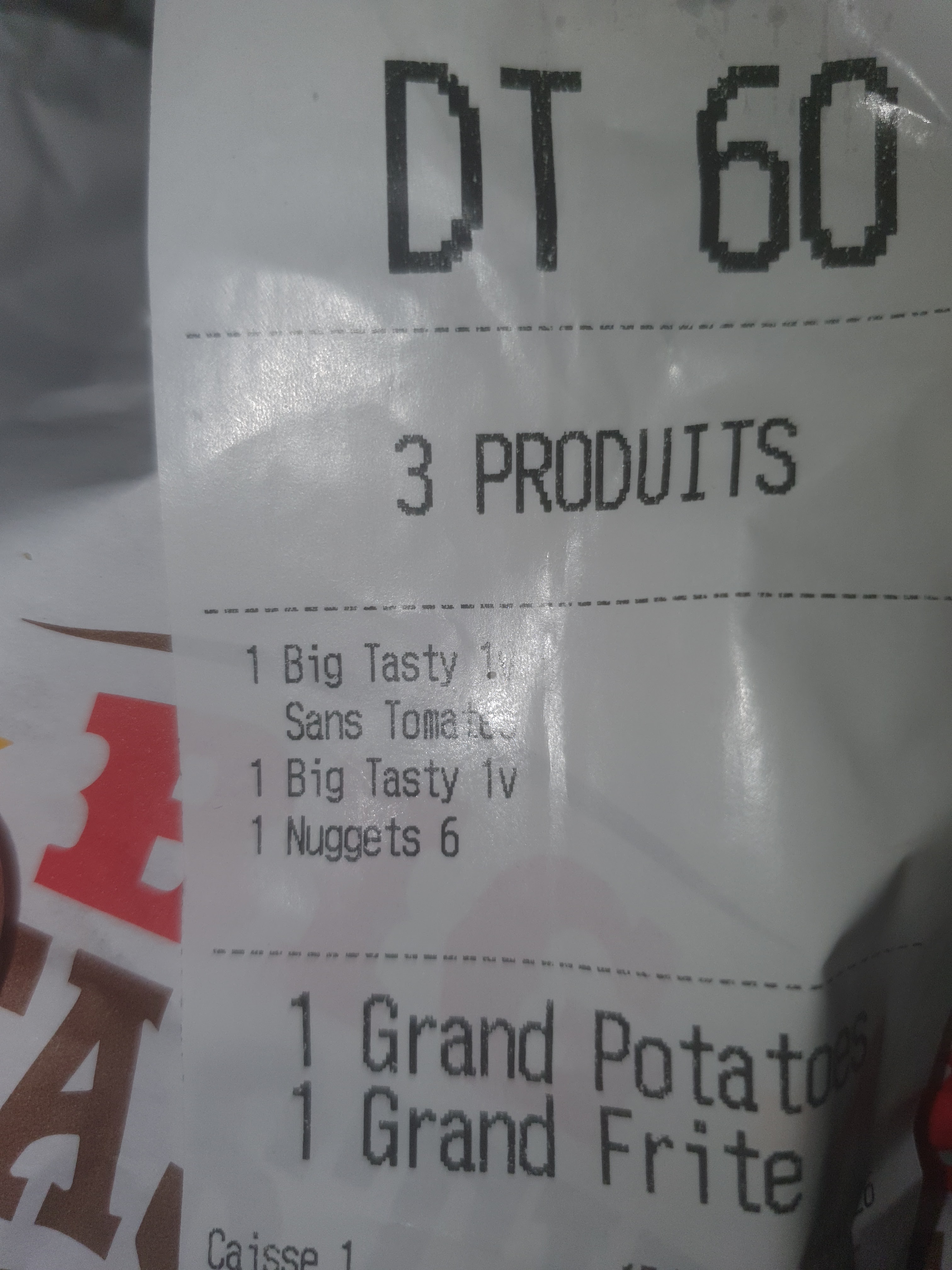 Vérifiez TOUJOURS votre commande. Seulement trois produits pris à emporter ce soir. Une grande fritte. Des nuggets et un Big Mac. Arrivé à la maison il manquait le Big Mac. La commande était pourtant simple. En colère. Vive Burger King.