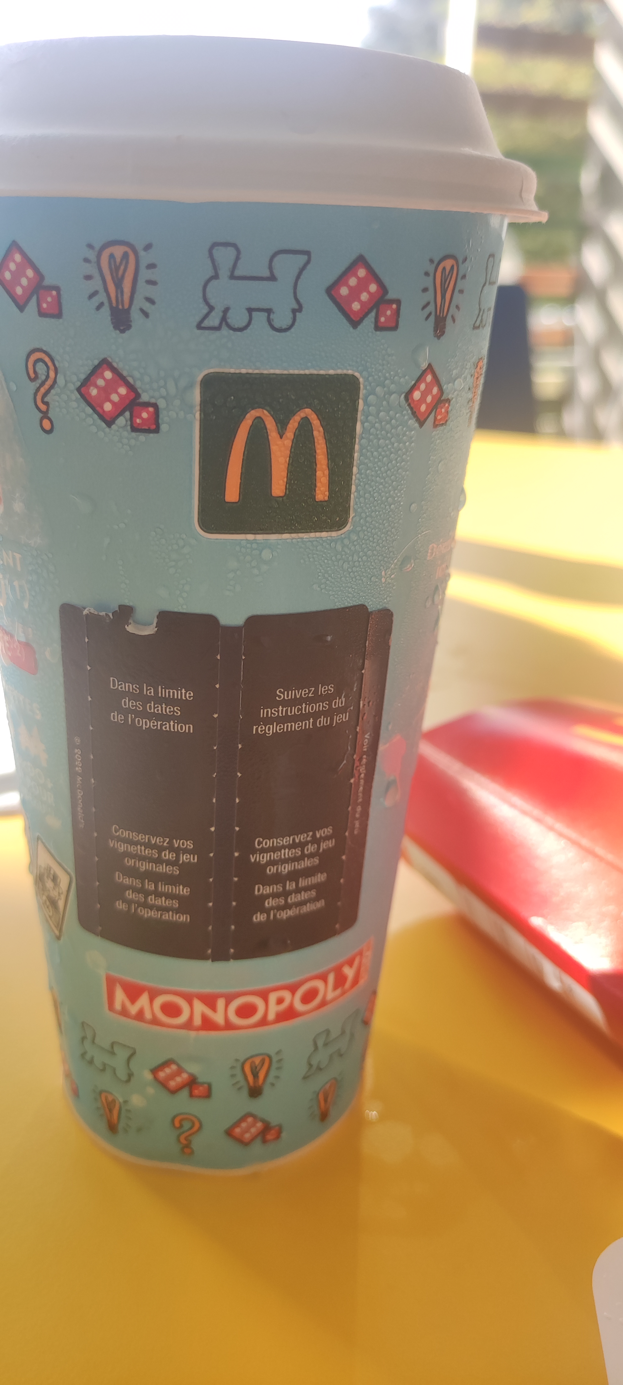 Commande via uber ce midi , sac arrivé bien fermé mais sur les 3 gobelets des menus les étiquettes Monopoly étaient enlevées J'ai essayé d'appeler pour manifester mon mécontentement.....aucune réponse Je trouve cela inadmissible de la part des équipiers qui préparent les commandes