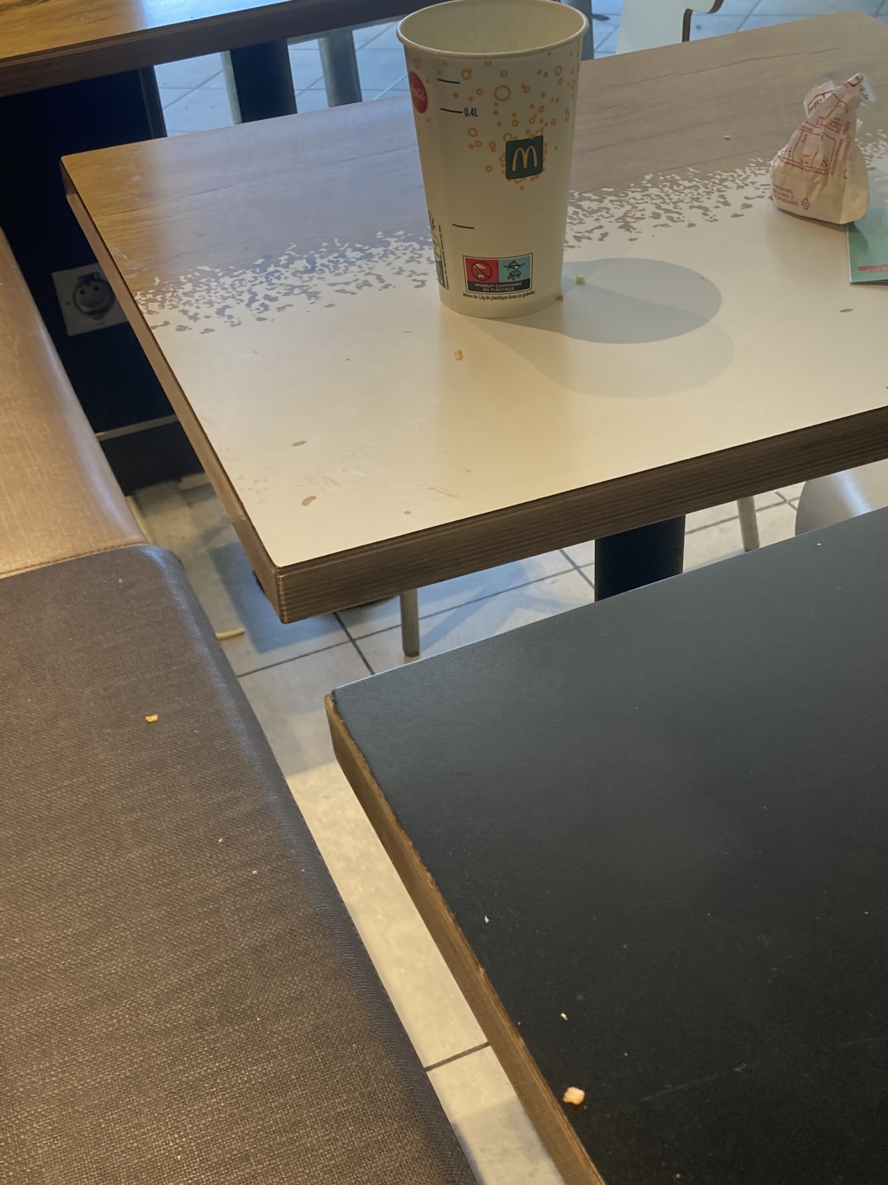 Mac Donald crasseux !!! Table grasse,sol poisseux ,déchets et restes de repas par terre….un des pires mc do!!!!