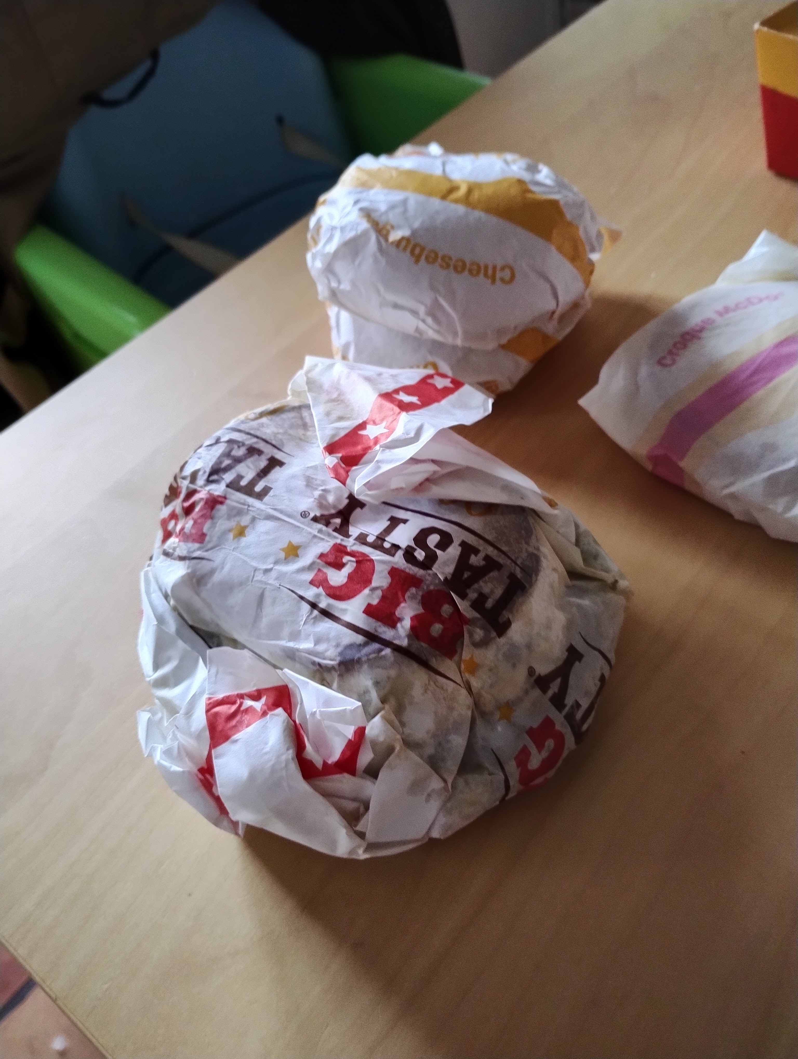 Après les oublis réguliers de sandwichs, de sauces, de desserts dans les commandes à emporter...les boissons gazeuses sans gaz...les couvercles de boissons qui ne tiennent pas (très pratiques en voiture), les sandwichs froids...aujourd'hui, le Mc Do St Genis Laval s'occupe de votre régime et invente le Big Tasty avec seulement la moitié du pain (pas de chapeau) et la boîte de nuggets x4 avec ...3 nuggets à l'intérieur ....merci Mc Do de prendre soin de ma ligne!! 😉 Dommage qu'il faille en arriver à tout vérifier, même à l'intérieur des boîtes alors que la confiance devrait être la règle...