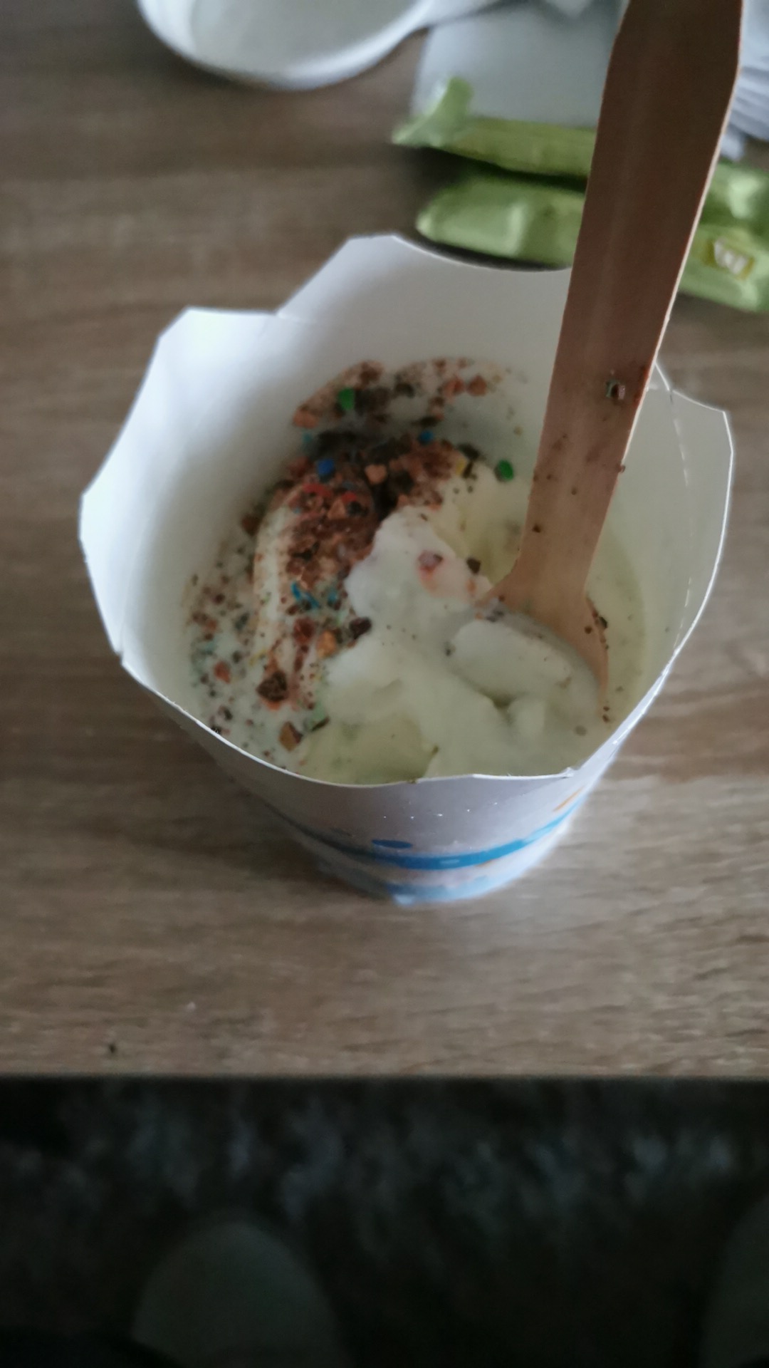 Tout le monde connaît cette enseigne, on aime ou pas peu importe. Mais la dans celui ci fait sérieusement revoir l’équipe, pas souriant pour un sous. Ensuite je demande un sundae. Mais la je savais pas qu’il y avait des mini sundae !! Je demande gentiment au monsieur qui a servis mon fils (qui lui même m’a dit papa regarde c’est bizarre la taille) de faire un normal. Il me dit ben non ça c’est la taille 😂😂😂 et il rigole…. Photo à l’appui. On dirait un truc déjà mangé. Courage au manager