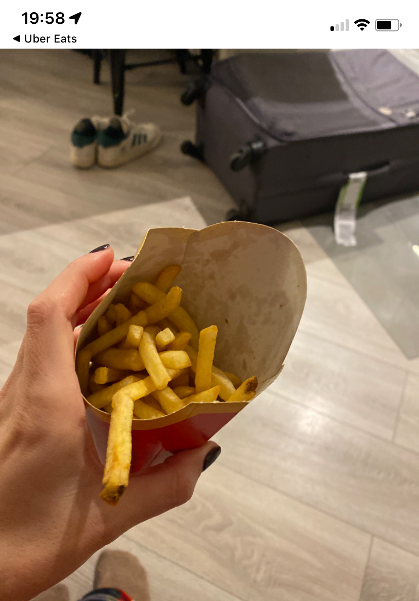 On m’a conseillé de bien mélanger la glace car la fraise était tout. Au fond. Ce que j’ai fait évidemment j’aperçois un lac de fraises en dessous de ma glace et vu la couleur de ma glace, je vous laisse imaginer l’État que je subis actuellement. J’ai commandé un wrap poulet qui s’est transformé en wrap. Poulet, marteau au vu de la galette bien dure comme un trottoir frite froide temps d’attente indéterminée et le macdo et sale j’ai l’impression de manger dans les poubelle
