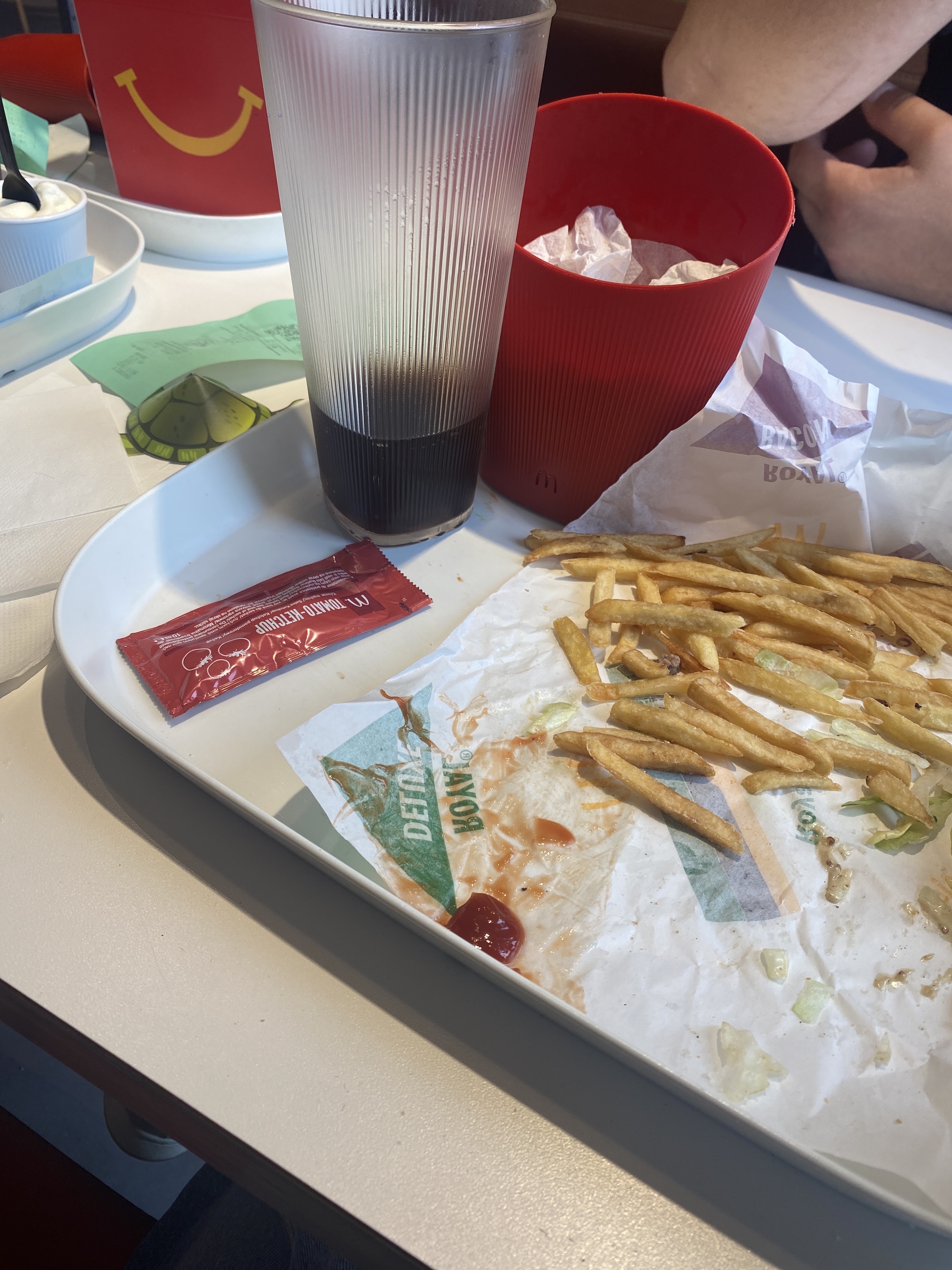 Plus de 15 min d attente à 16h30 un lundi. Frites froides, big mac froid et le pain comme.une impression sorti du frigo tellement froid. De plus j ai pas.eu le verre alors que j ai cde un maxi best of. La table salle et poubelles et reposes plateaux débordants.