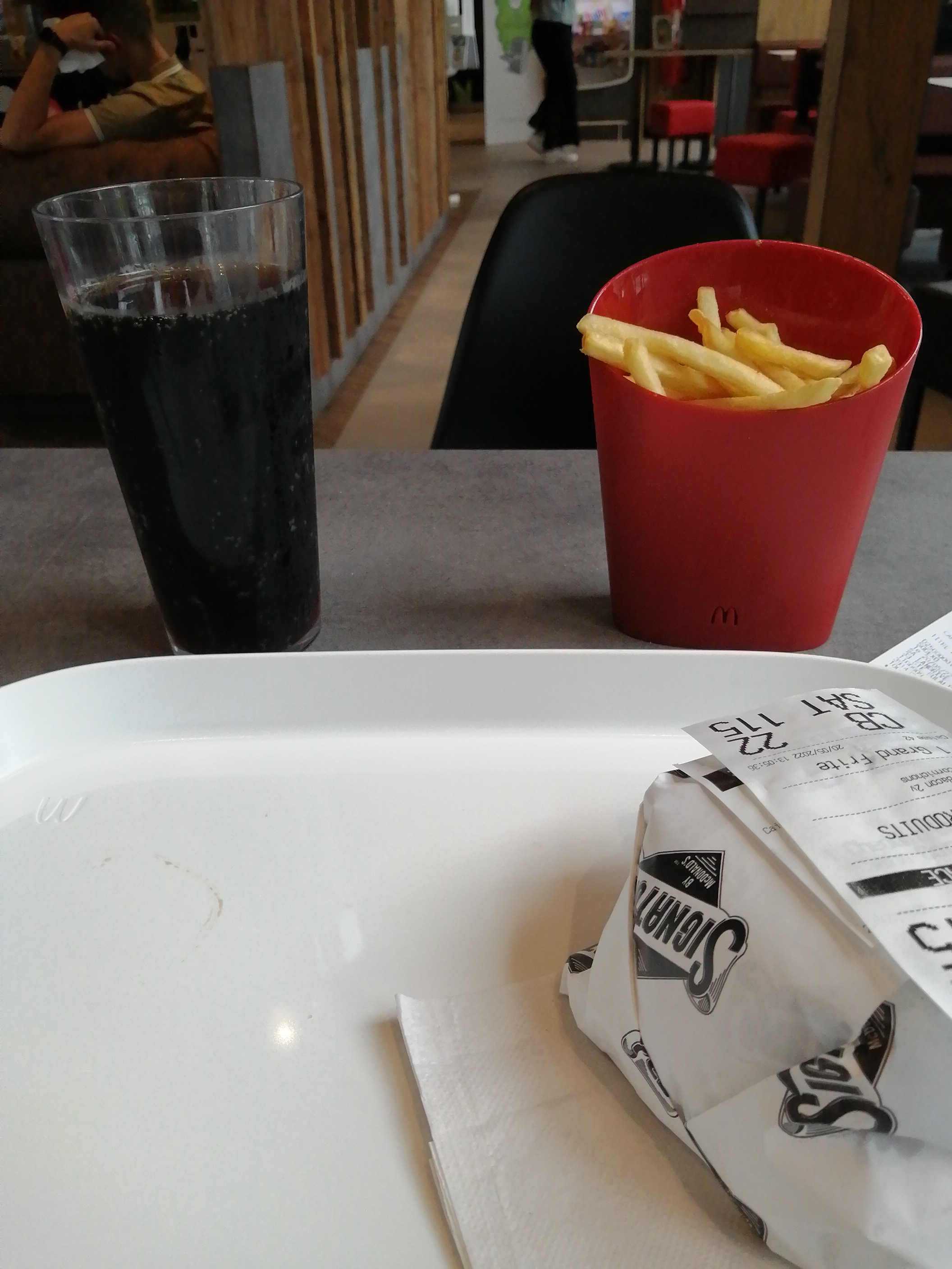 Au drive ce jour 18 août. Attente 10 minutes à la borne. Aucune attention pour excuser du retard. Frites molles, filet o fish froid, double cheese sec, et le comble pas de paille pour boire le yaourt. Zéro pointé