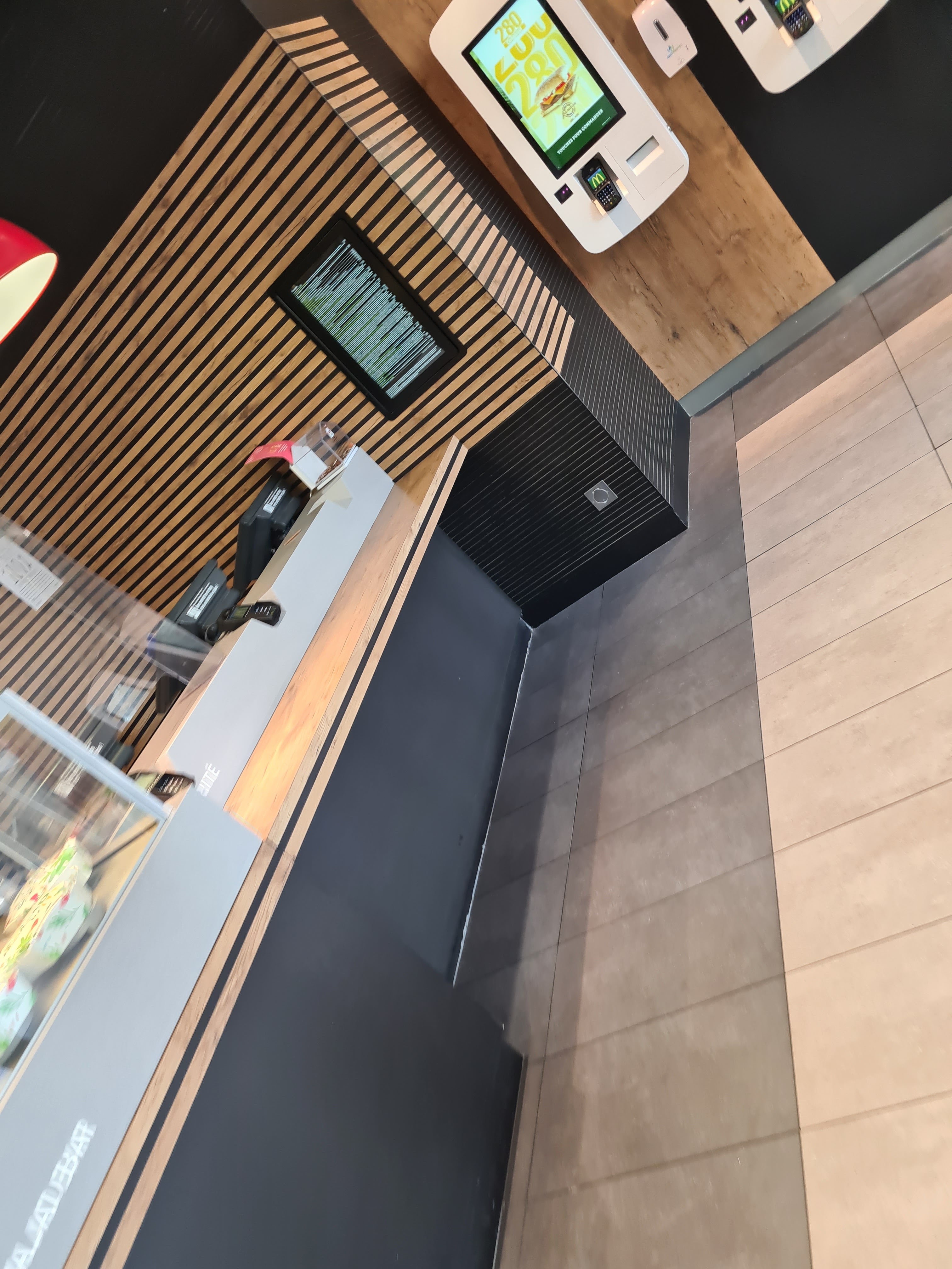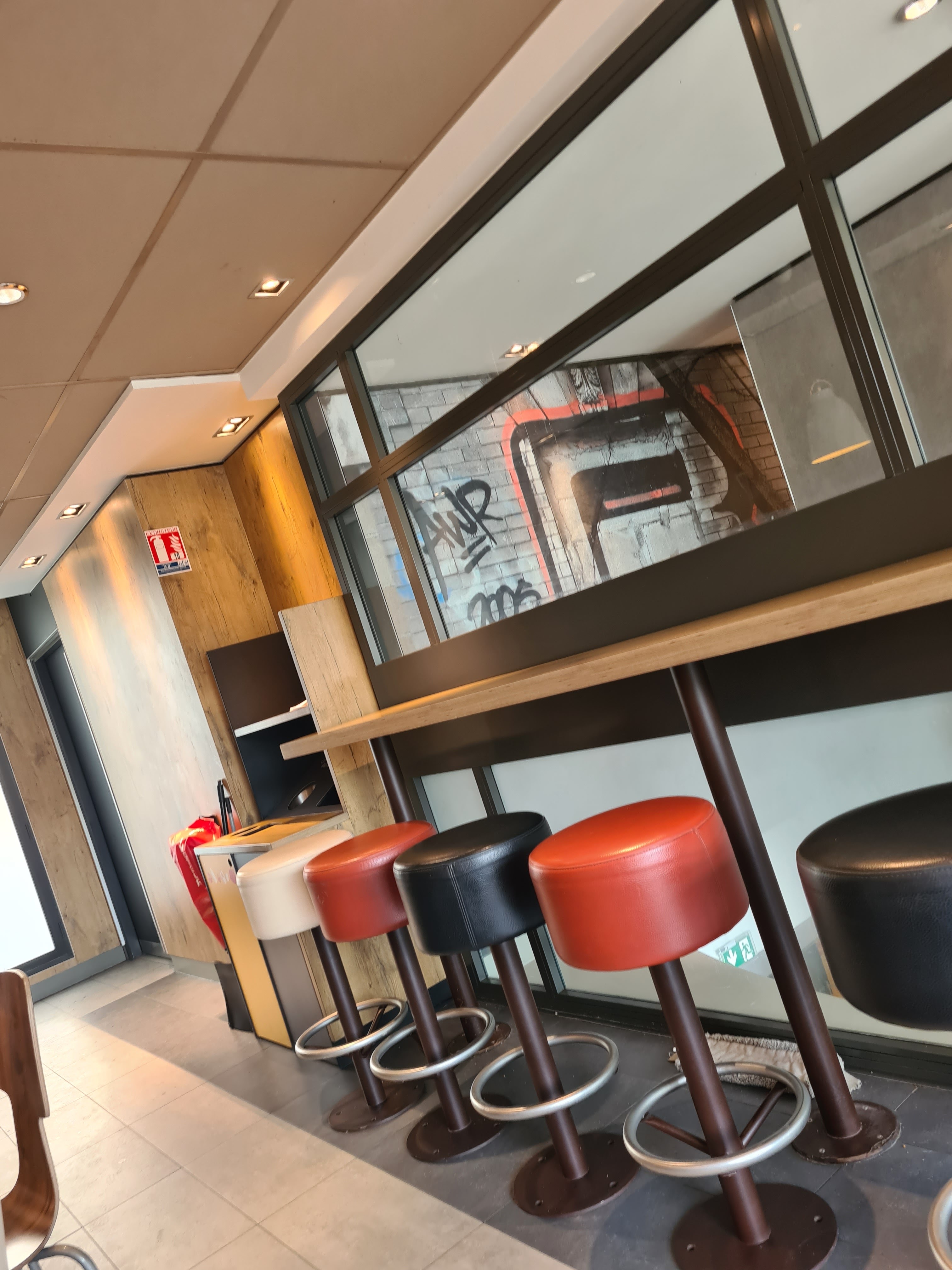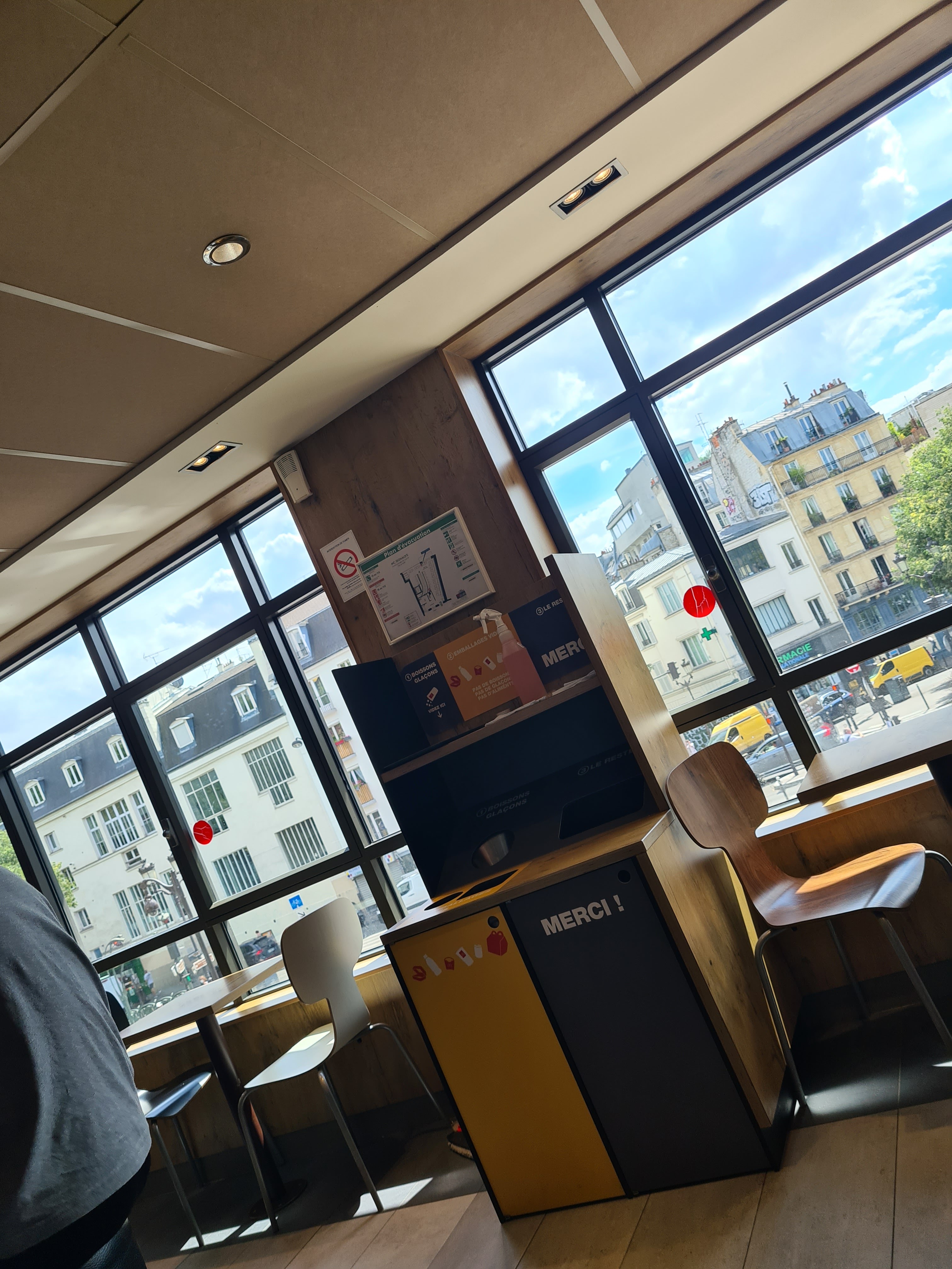 C'est un McDo c'est très bien parce que c'est McDo il y a même des tables des tables comme dans tous les McDo avec des chaises comme dans tous les McDo j'ai même commander un hamburger et un Big Mac comme dans tous les autres McDo j'ai pu faire ma commande aux bornes les bornes McDo qu'on peut retrouver dans tous les autres McDo