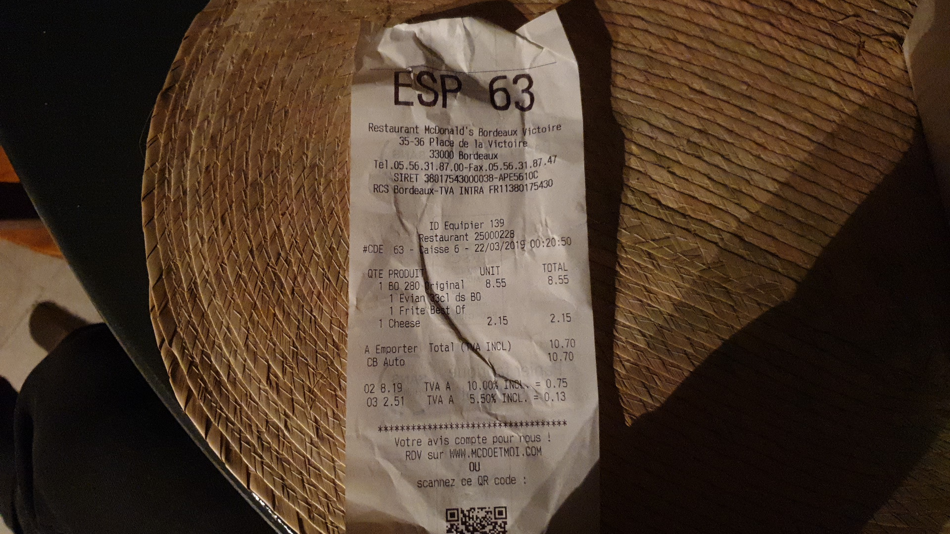 2-3 fois par an, parce que je n'ai pas le choix, je prend a emporter dans ce mcdo. Comme à chaque fois je prend un menu 280. Comme à chaque fois il est froid et raté alors que les autres mcdo savent le faire. Un problème? Pour info c etait la Commande 63 en espèce de 00:20. #boloss #cuisto #en #carton #arnaque #boycott #plusjamais