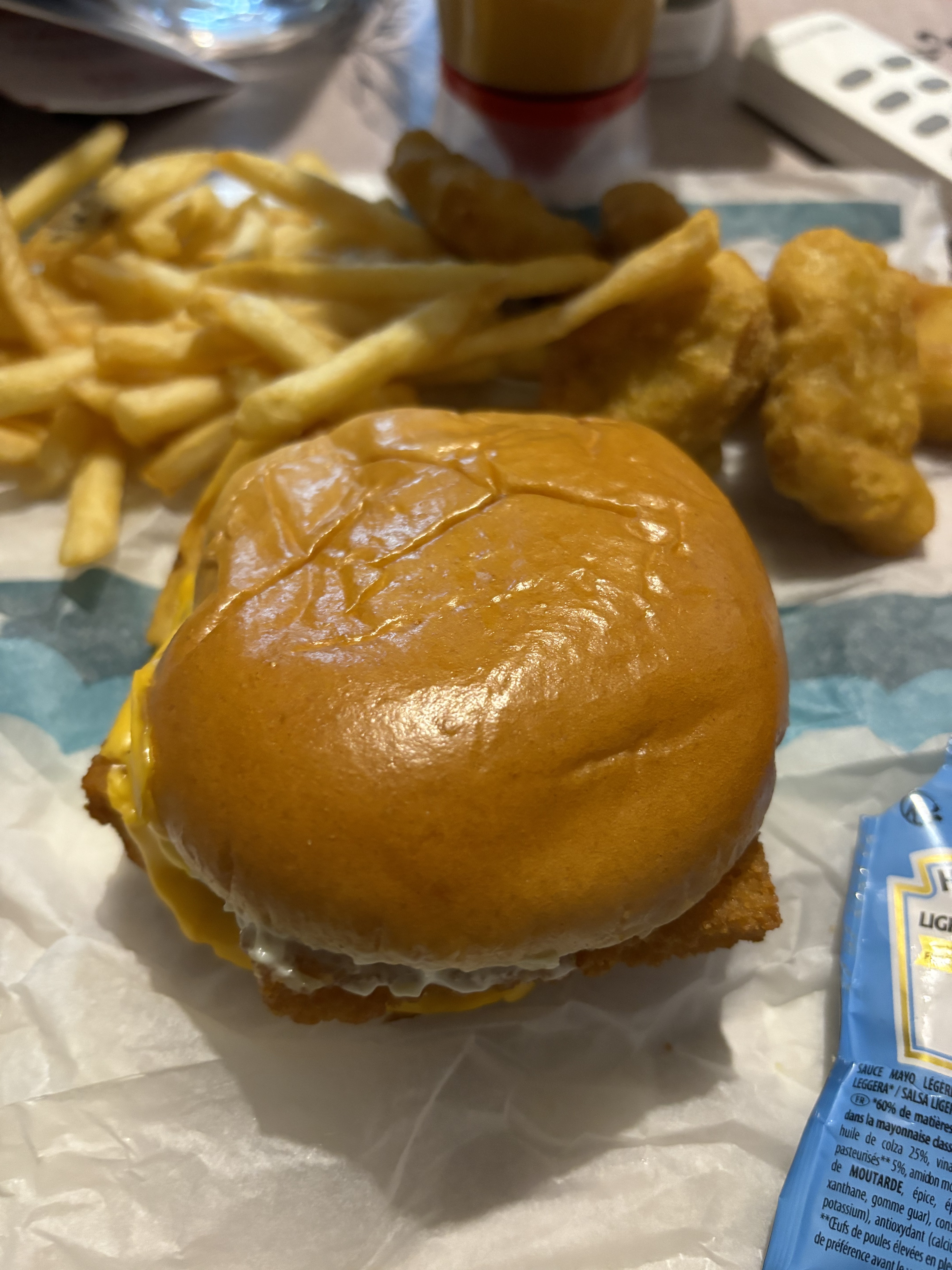 Encore une fois un oubli ! C'est assez récurrent.. et cette fois c'est le jouet du menu enfant.. si vous avez des enfants vous comprendrez le drame .. le sandwich froid .. vraiment bof Je mets 3 étoiles parce que j'ai fait ce métier pendant des années et que l'équipe (pas tous) sont là plupart du temps sympa ! Et c'est vraiment pas un métier facile ! Mais sérieux faites attention aux commandes !!