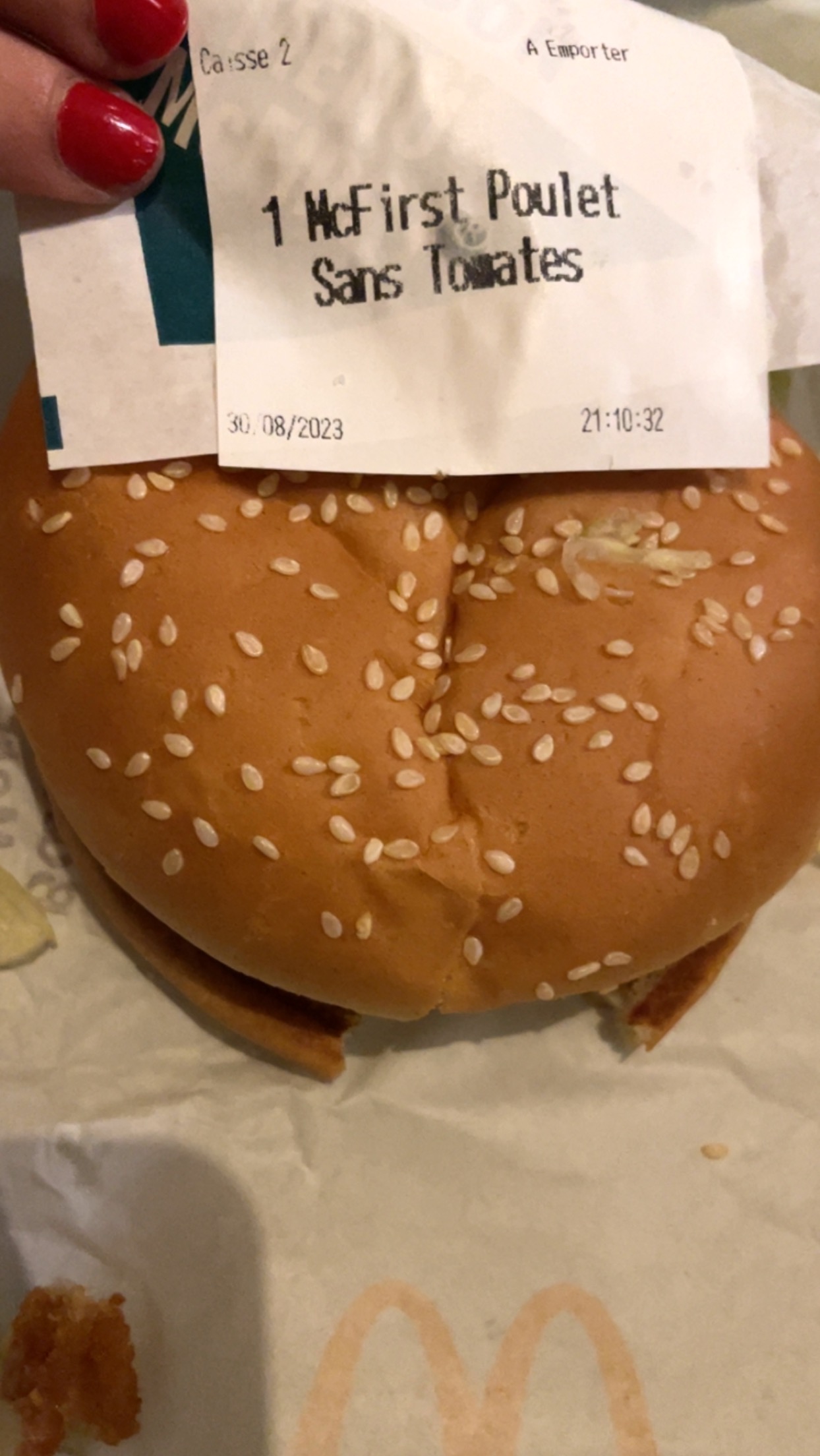 Je demande un poulet mais j’ai du poisson… dernier fois a ce macdo ce n’est pas la première fois que ceci arrive passage le 30/08 après 21h au drive.