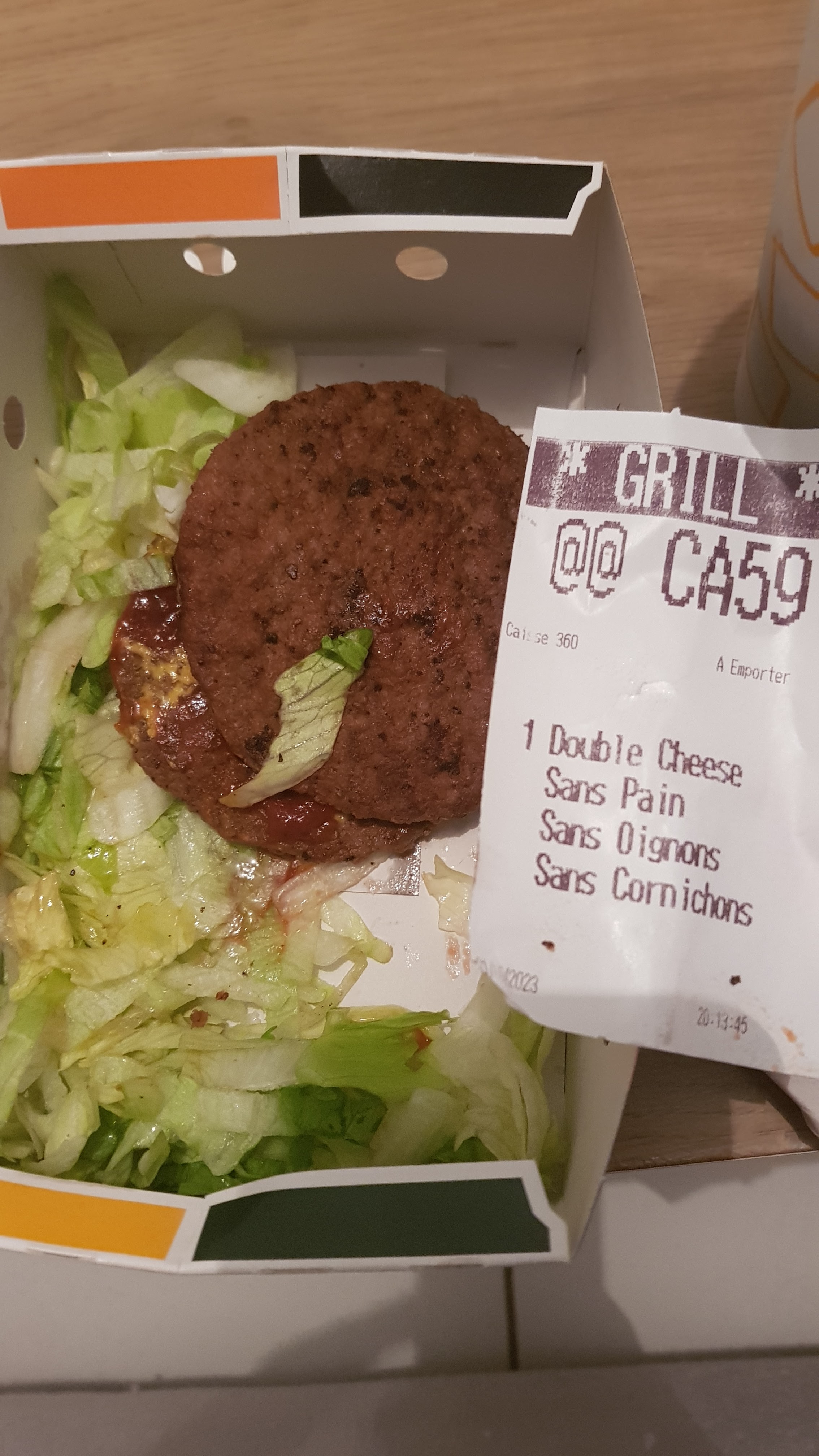 1 fois on demande un double cheese bacon, on reçoit un cheese bacon avec 1 seule viande. Cette fois-ci, la photo parle d'elle-même. On demande un double cheese sans pain, oignons et cornichons... On reçoit quoi ? Deux steaks, de la salade et finito. Il est où le fromage ??? Et que fou de la salade dans un double cheese ?? Vous savez faire des commandes personnalisées ou pas ? Apprenez le à vos employés de cuisine.