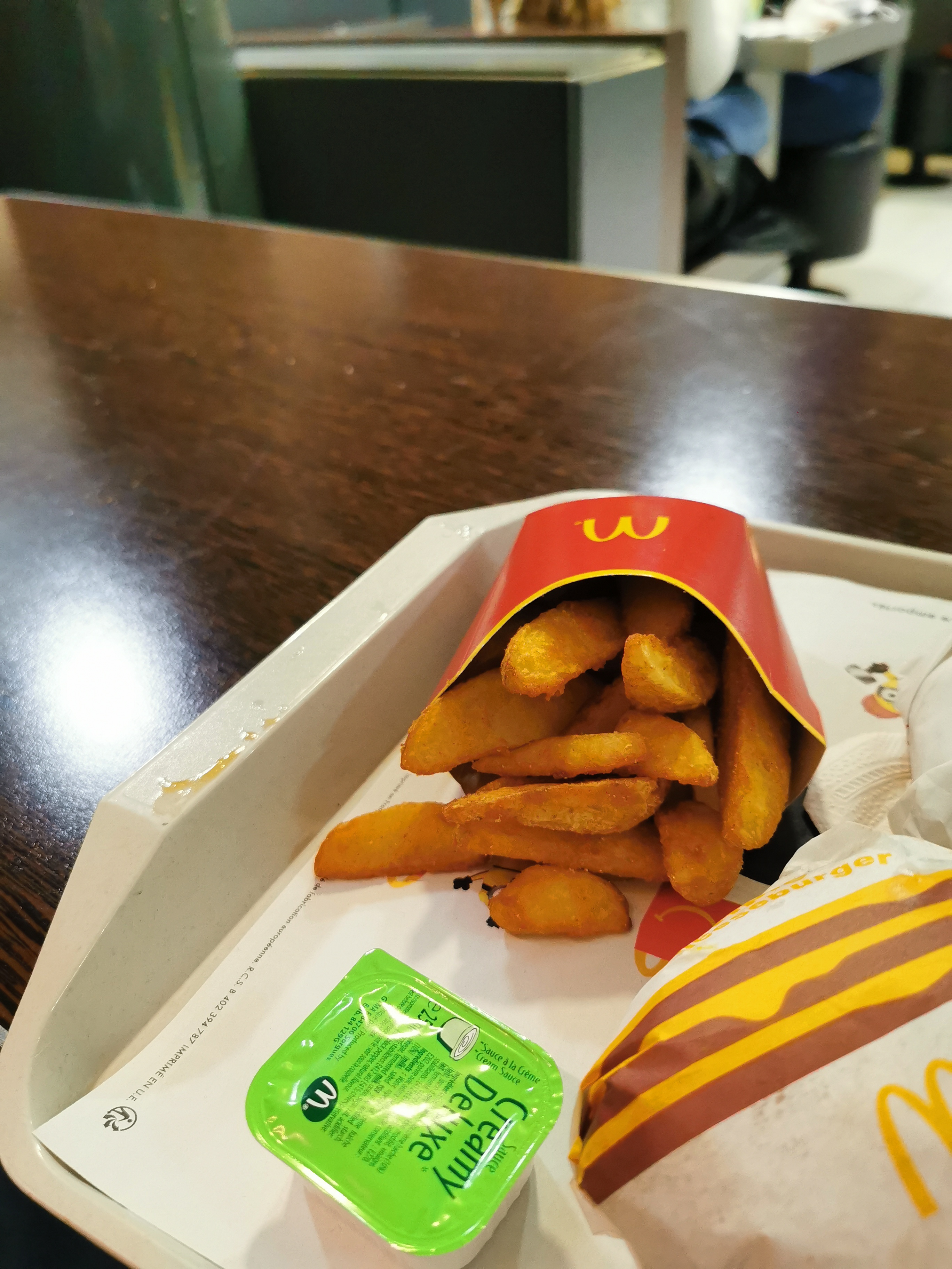 Mac Do bien agencé, sur 2 niveaux, grande salle Vaisselle non jetable : c'est bien pour la planète ... Bonnes potatos